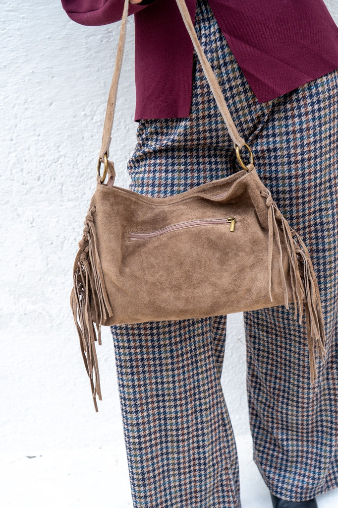 Leather handbag, plain, with fringe on the sides, short and long handles. In taupe color.