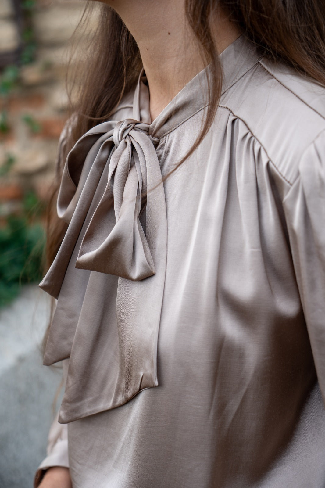 Blouse with V-neck, tie at the neck, long sleeves with cuffs, satin in champagne color.
