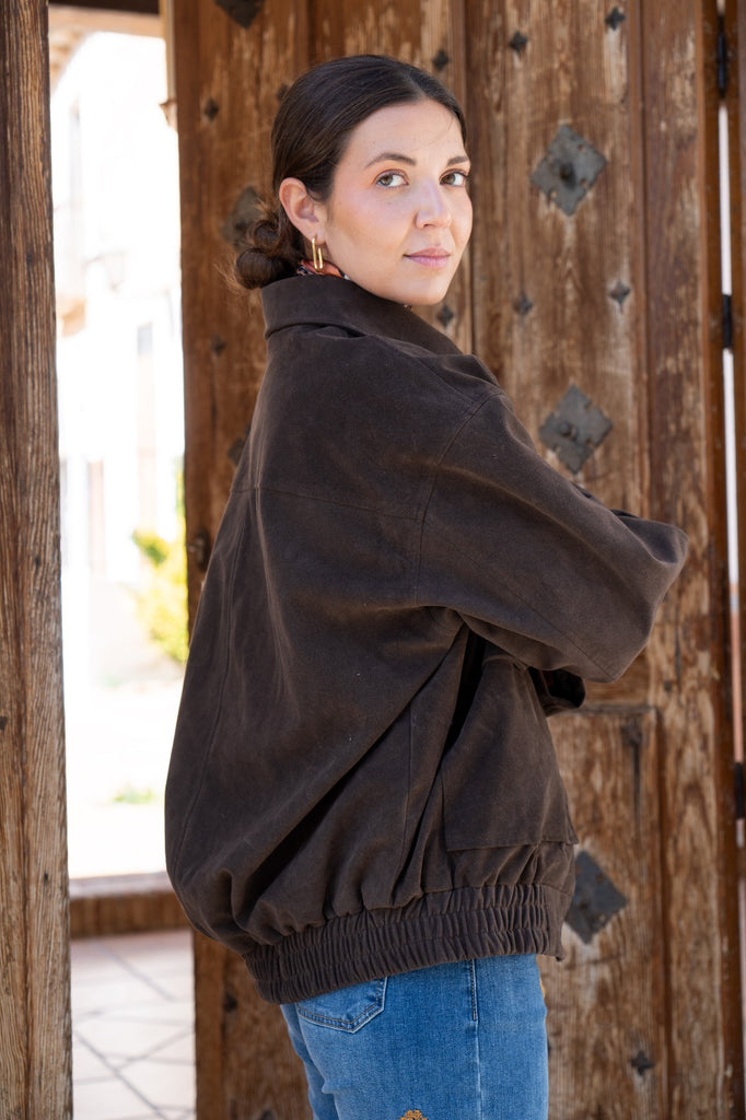 Brown leather jacket, lapel collar, zipper, front pockets, elastic at the back.