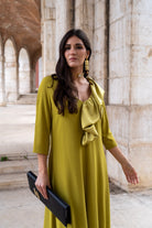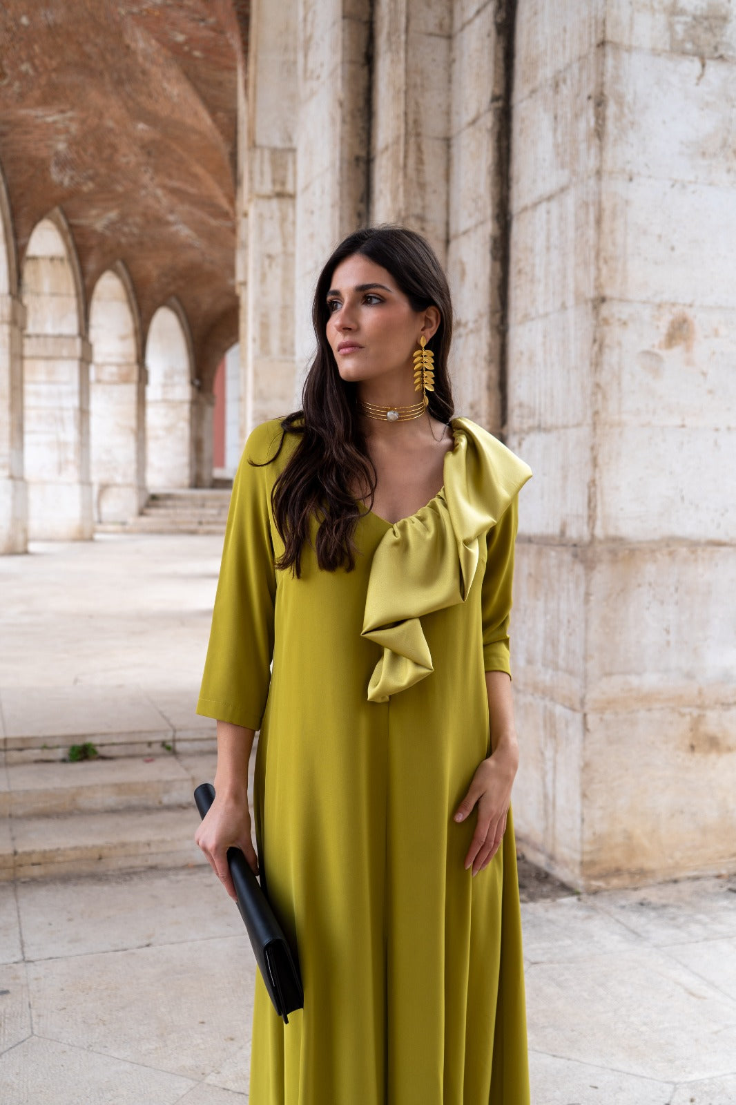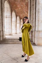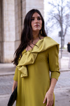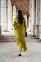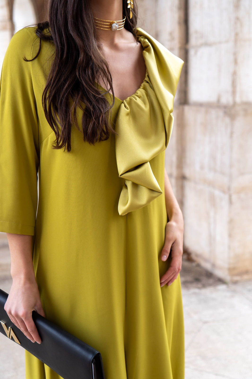 Midi dress, V-neck with a ruffle on one side, three-quarter sleeves, side pockets, longer at the sides, loose fit. In olive color.