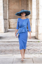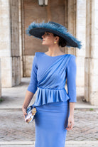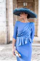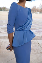 Midi dress, round front neckline and V-neck back, three-quarter sleeves, peplum waist, back slit. In blue.