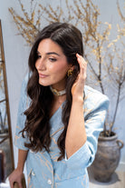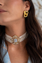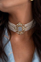 This choker, composed of multiple strands of tiny pearls, sits softly and elegantly around the neck. At its center is an ornate, teardrop-shaped medallion.