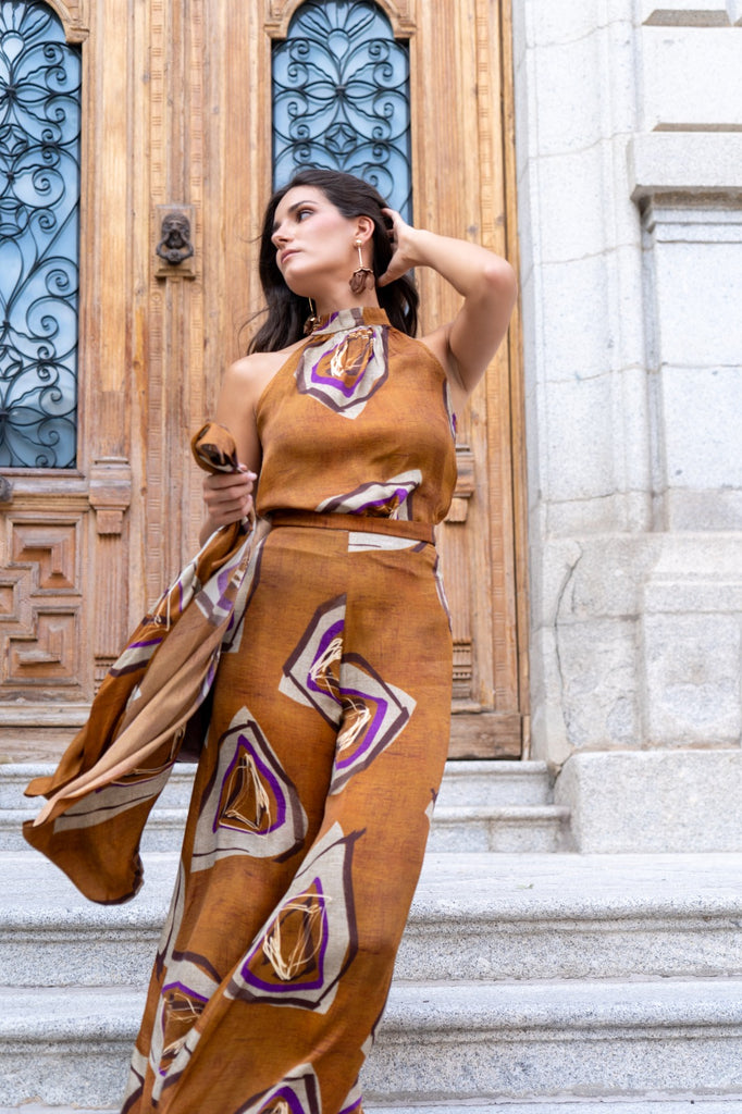Set consisting of a sleeveless, gathered-collar shirt, a long-sleeved overshirt, and wide-leg, high-waisted trousers. In brown with a print.