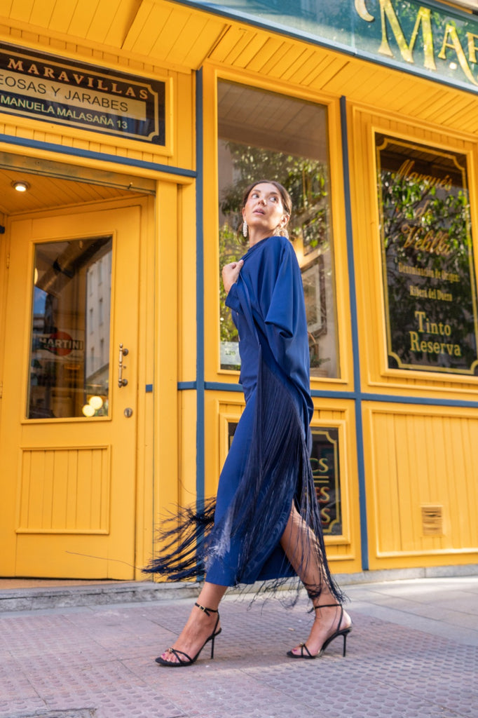 Midi dress with a high round neckline and sheer strap, three-quarter sleeves, a back slit, and a fringed kaftan with a sash. In blue.