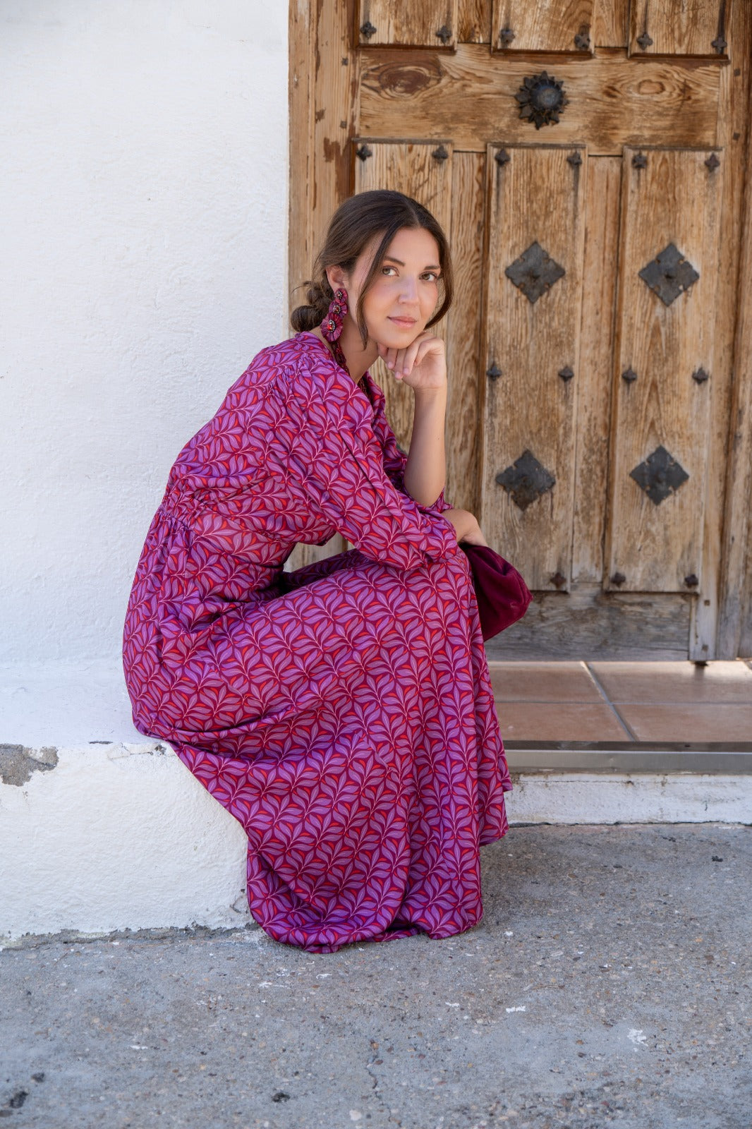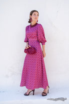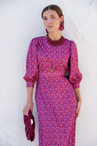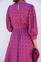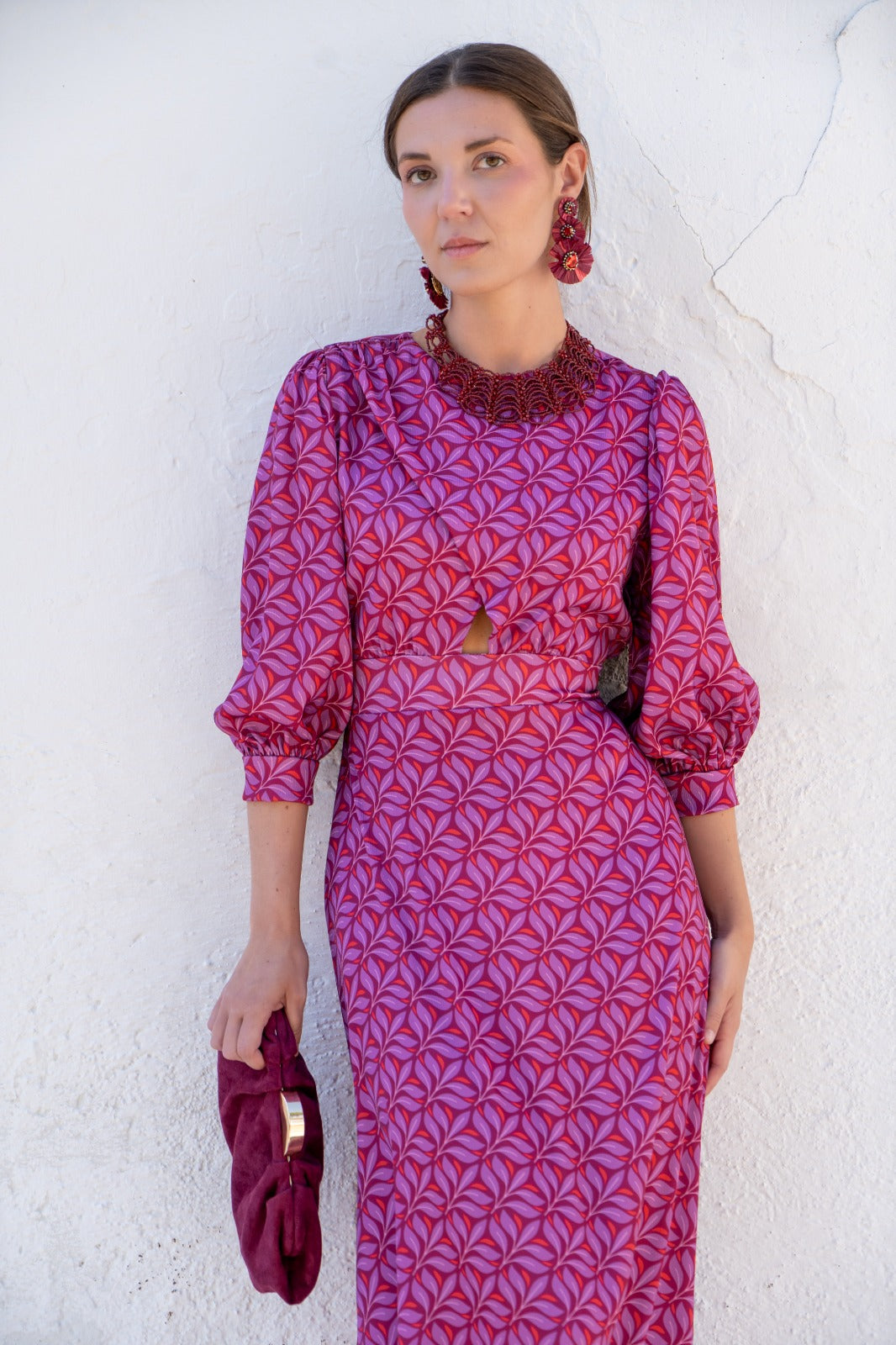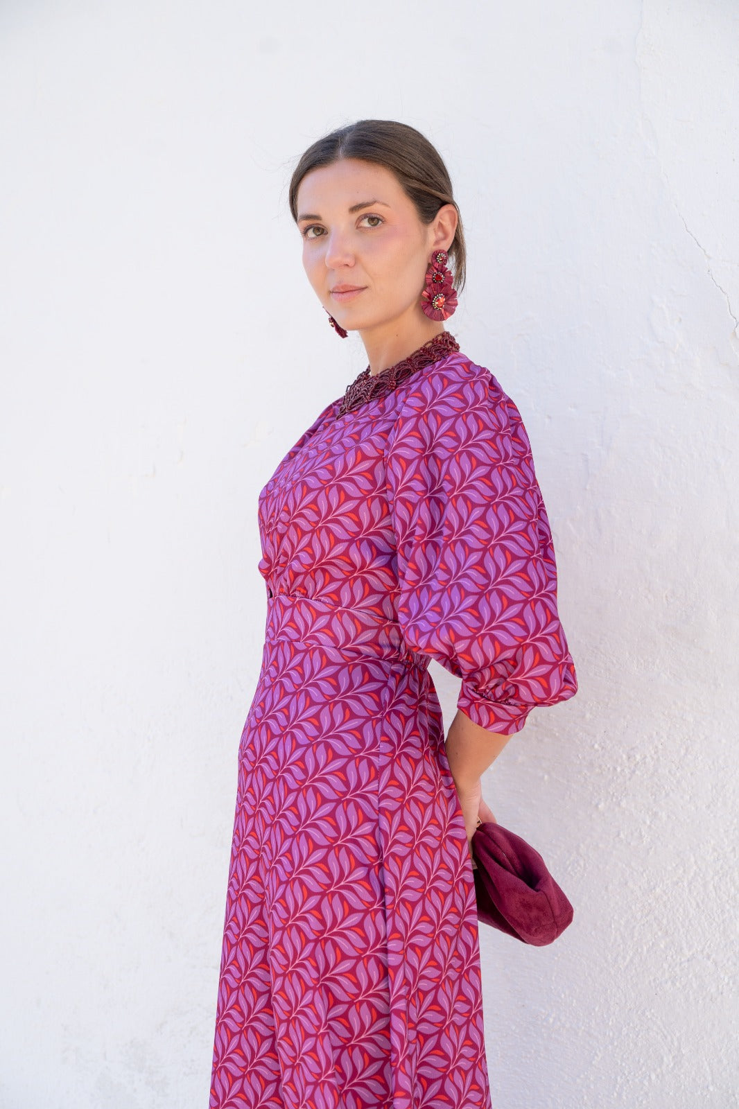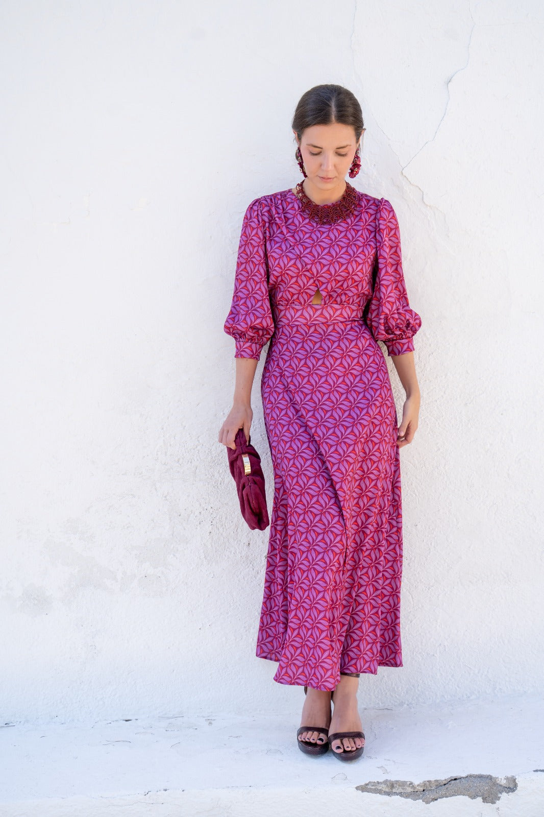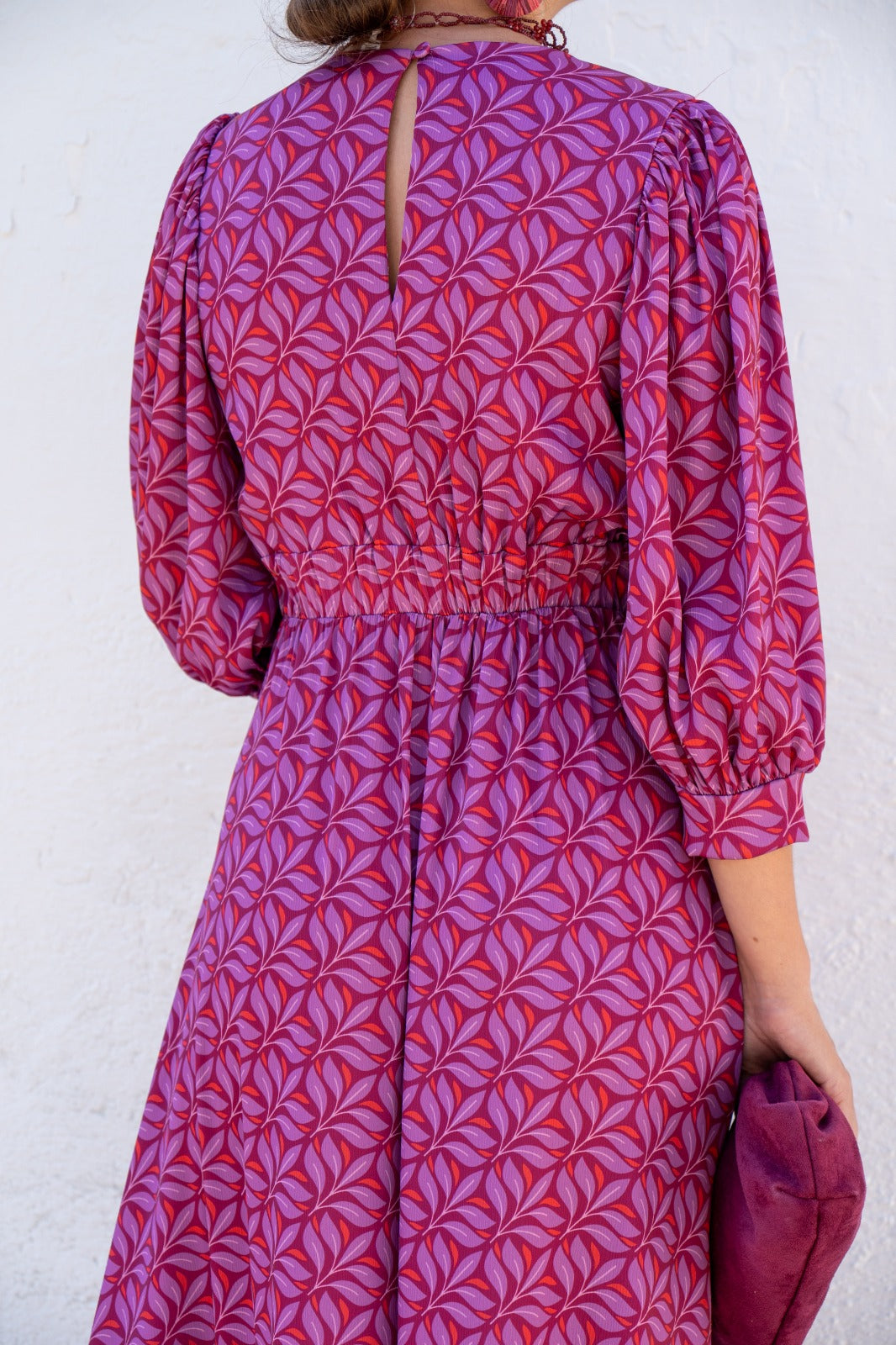 Midi dress, round neckline, three-quarter sleeves with cuffs, front cutout, elasticated back waist, flared skirt. Purple print.