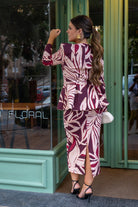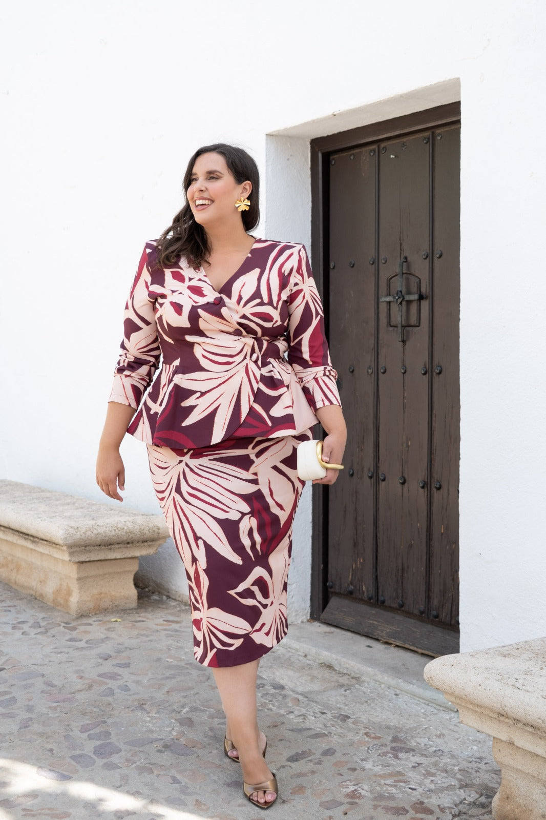 A matching set consisting of a button-down, double-breasted jacket with long sleeves, a peplum detail, and a high-waisted pencil skirt with a back vent. Available in printed colors.