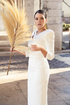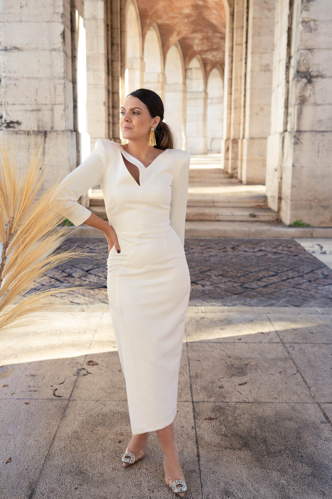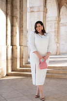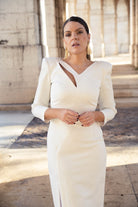 Midi dress with a V-neckline and small slit on one side, three-quarter sleeves, and a side slit in the front. White with a silver lurex pattern and detailing.