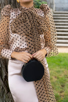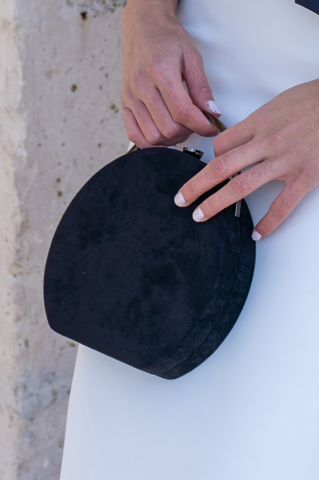 Handbag lined in black satin, rigid handle and silver-colored chain for hanging.