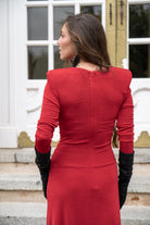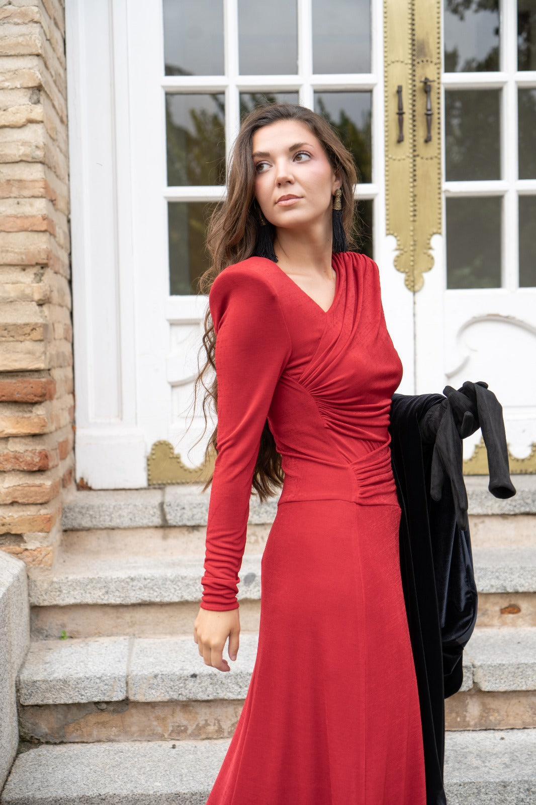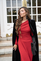 Knit dress with long sleeves and draped bodice Leaving the neckline asymmetrical, layered skirt. In red.