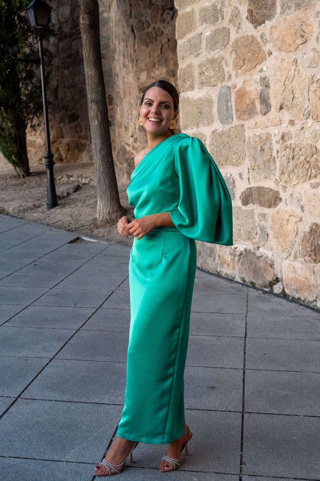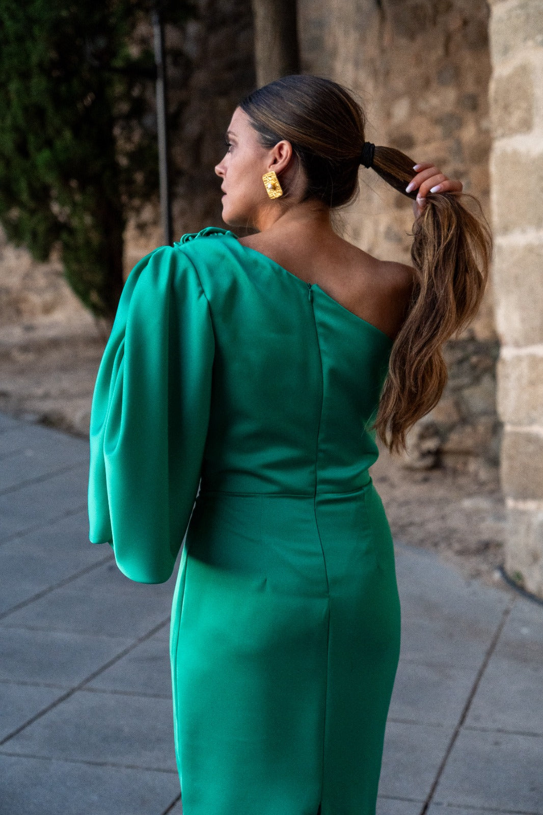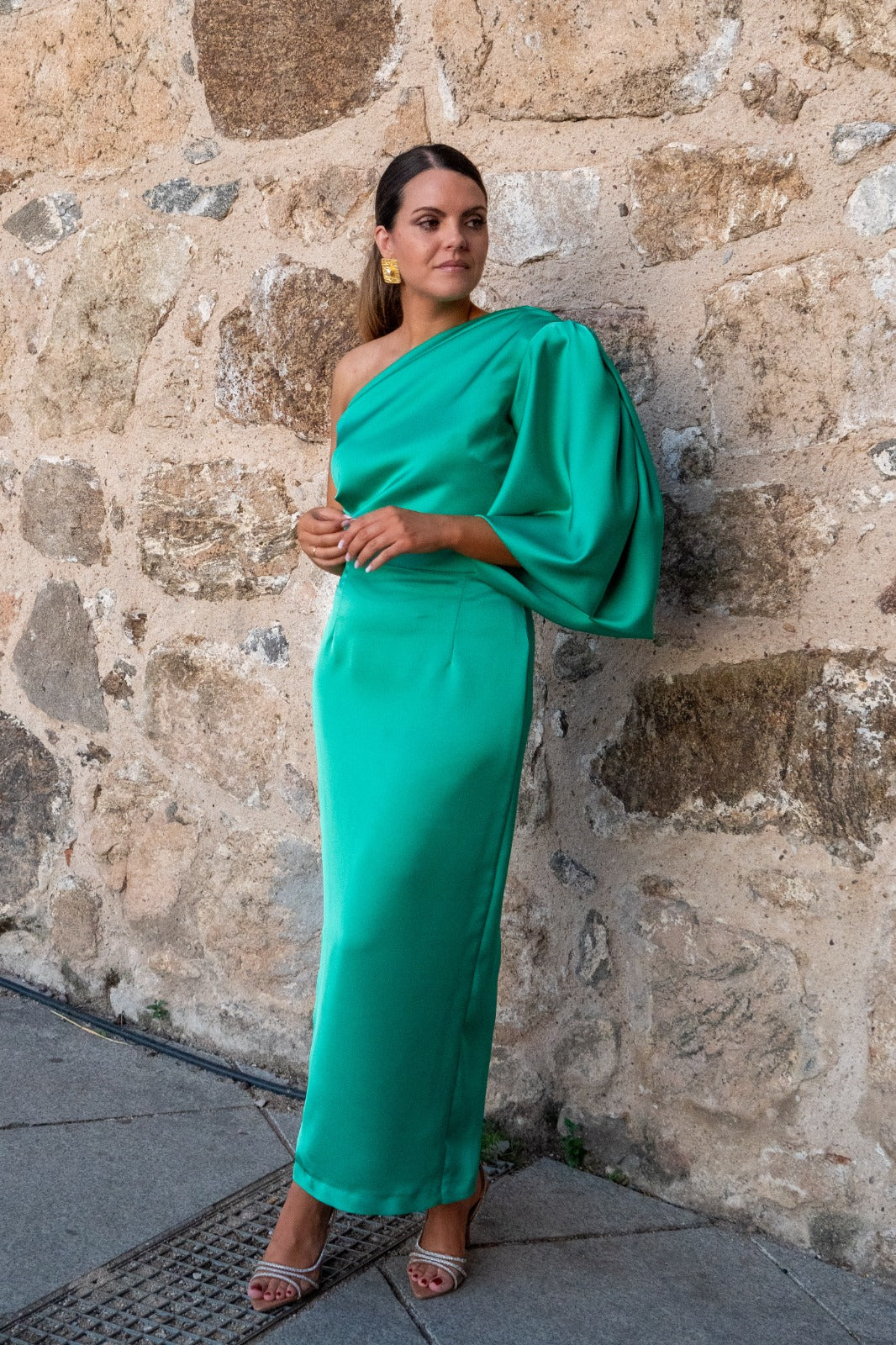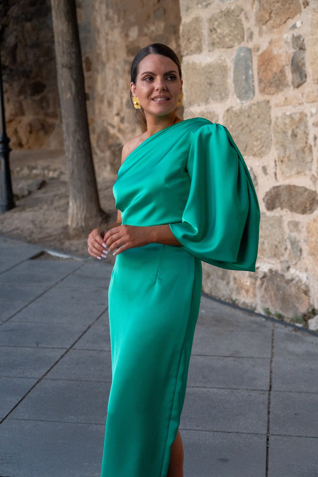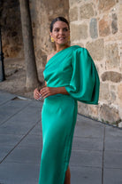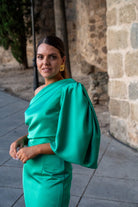 Midi dress, asymmetrical on one side, short sleeves gathered and wide on the other shoulder, cut at the waist, and slit in the back. In green.