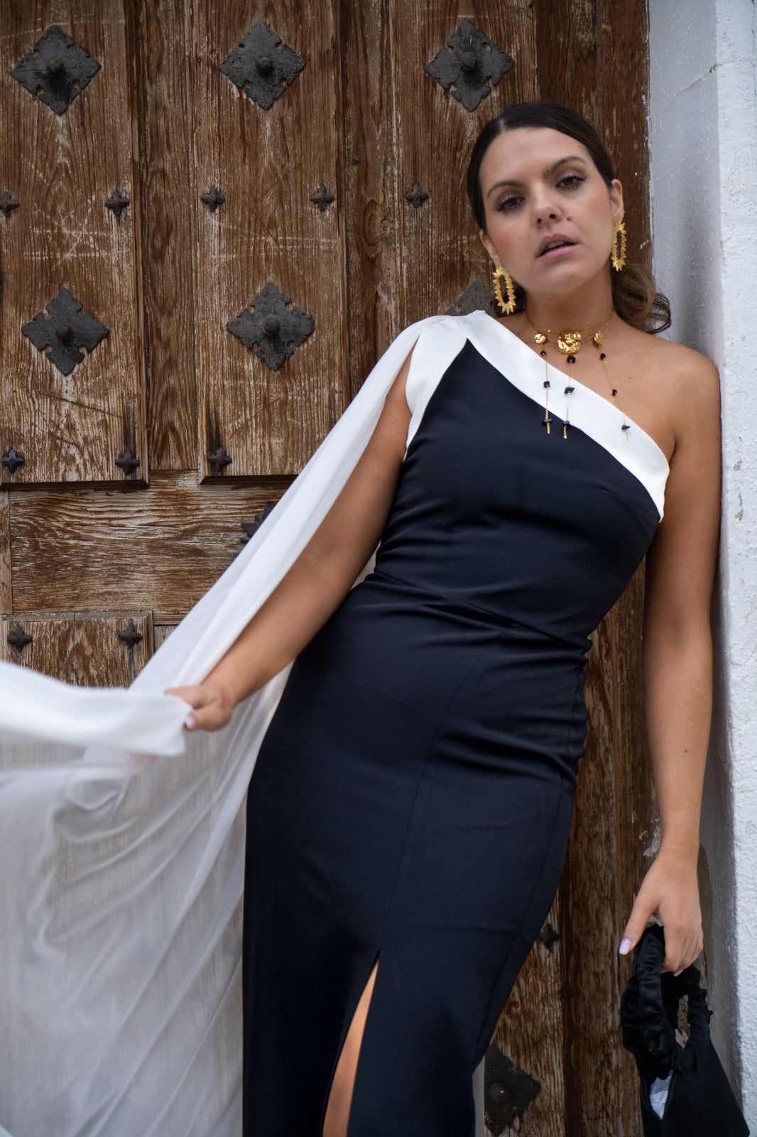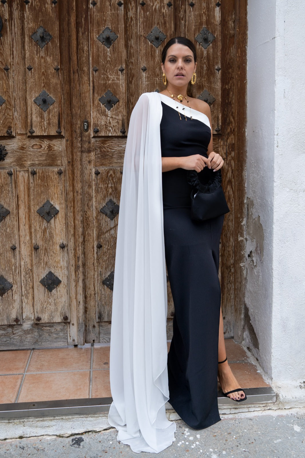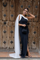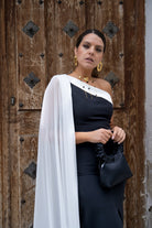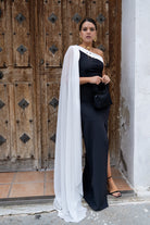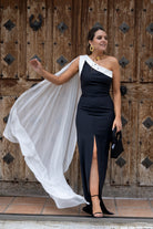 Long, asymmetrical dress with a long cape on one shoulder and a front slit on one side. Two-tone black and white.
