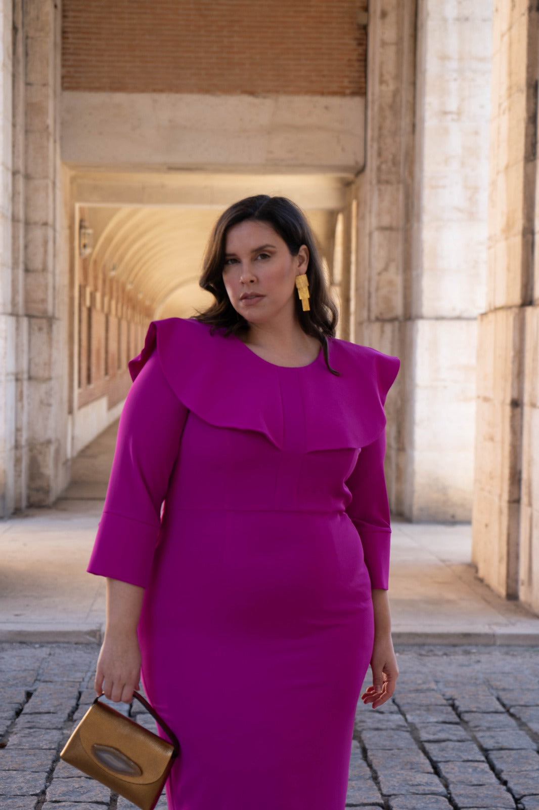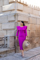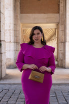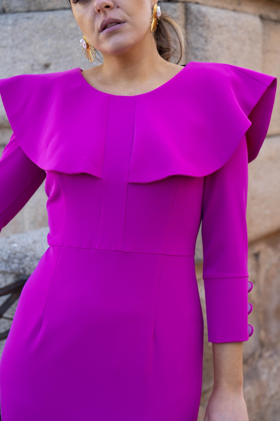 Midi dress with a round neckline and ruffle at the top, three-quarter sleeves with buttoned cuffs, a waistline, and a back slit. In pink.