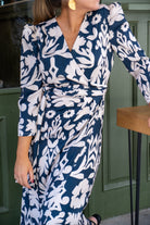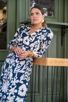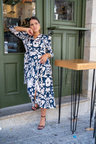Wrap dress, crossover style, tied at the side. In a beige and blue print.