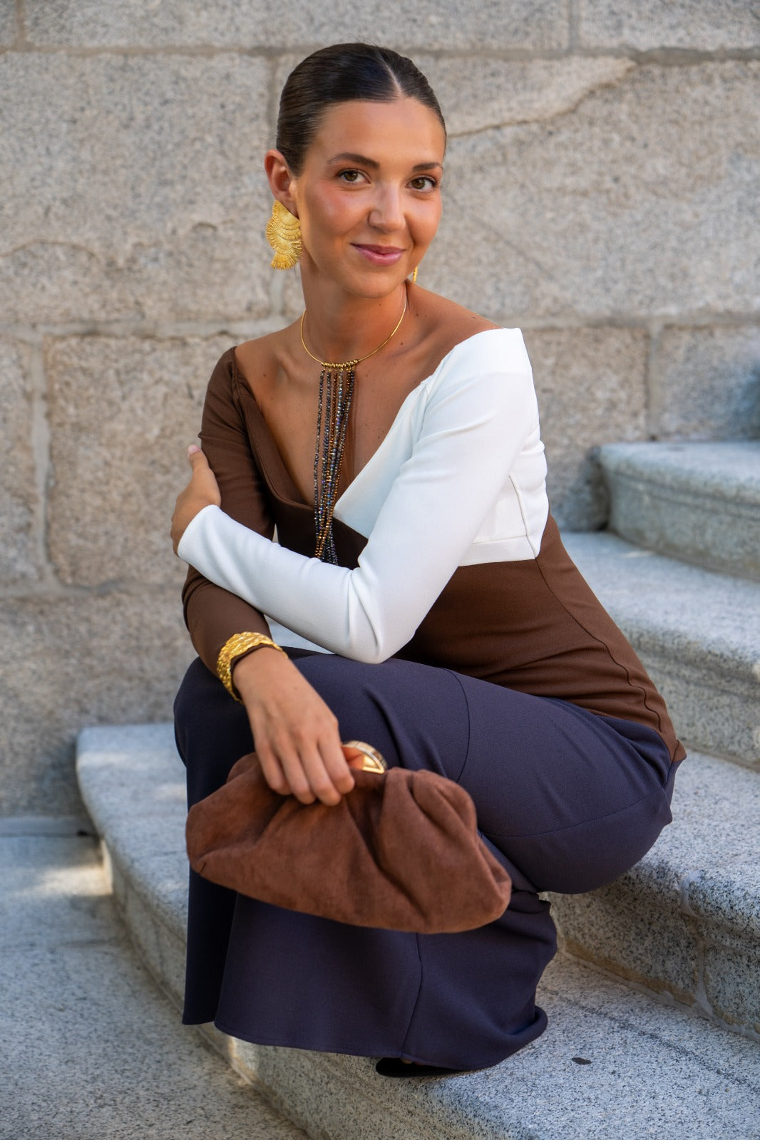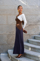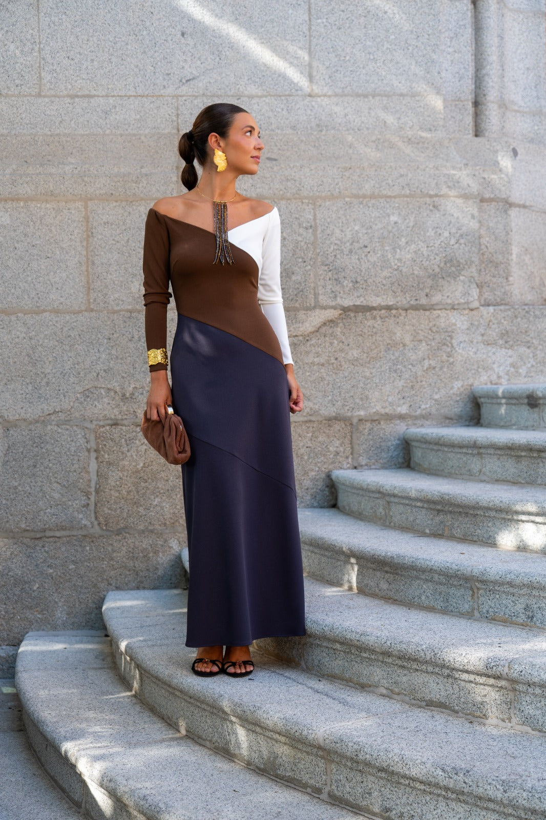 Fashionable dress, Bardot neckline, long sleeves, flared. In tricolor knit brown, white and gray.
