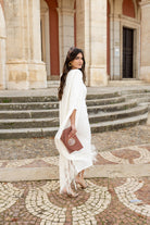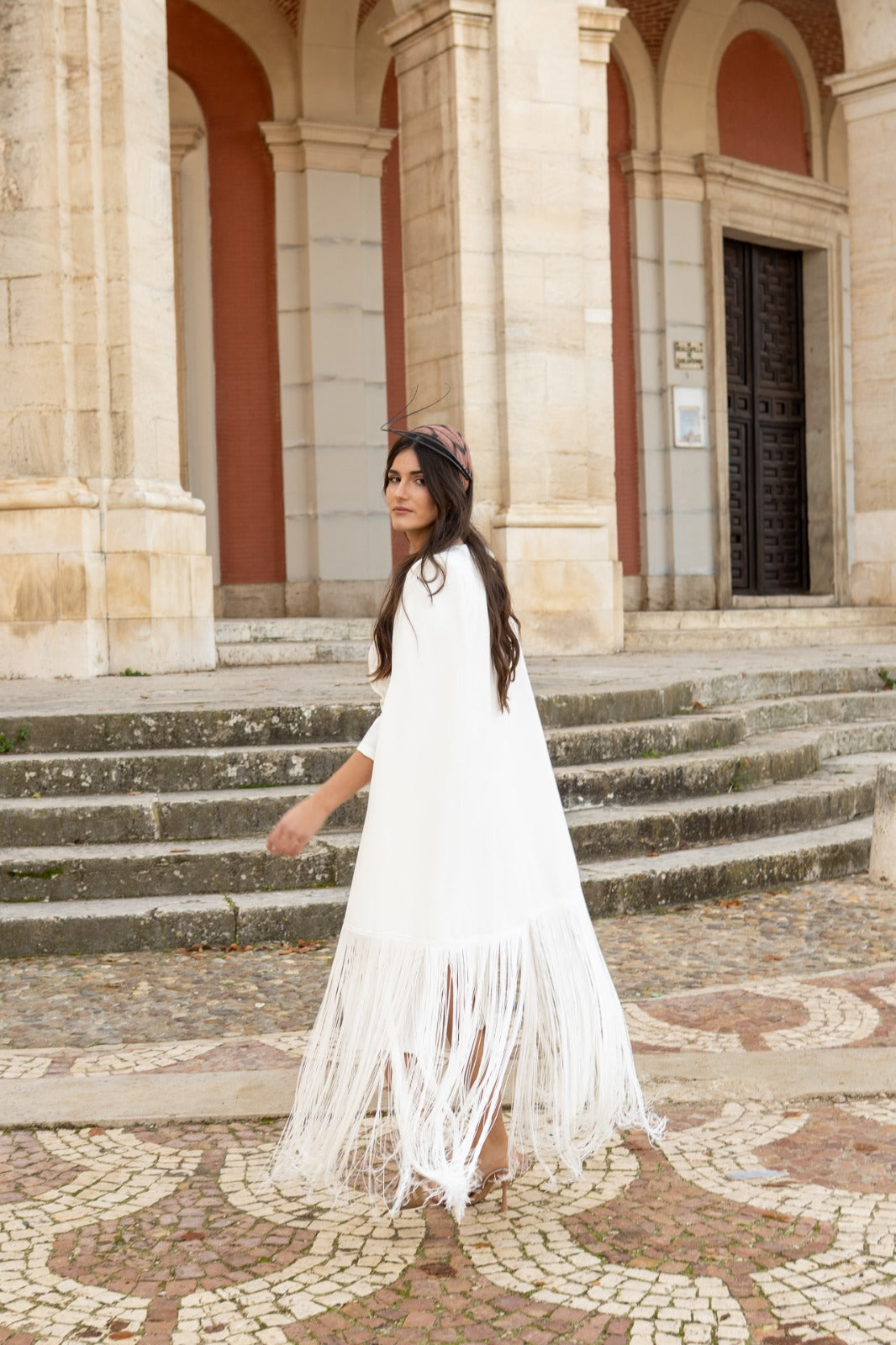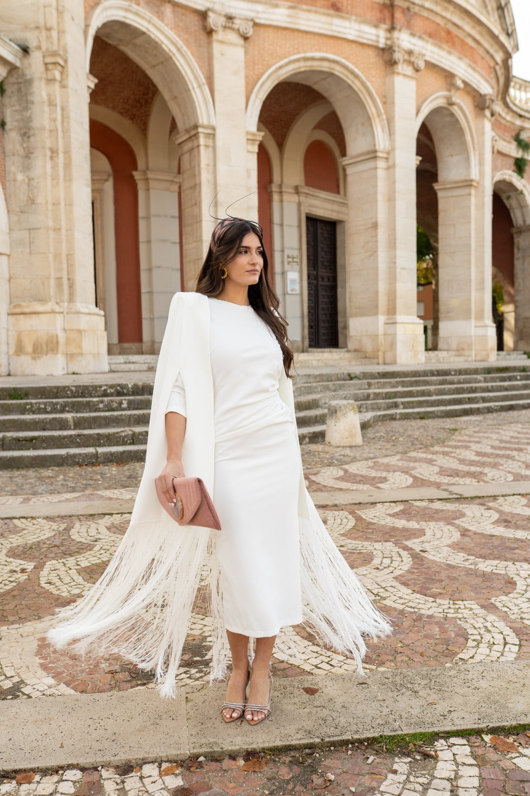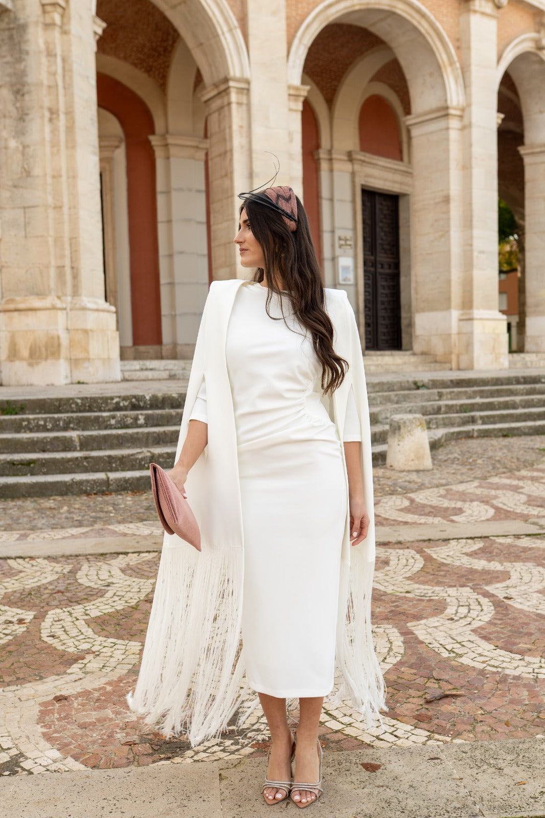 Midi dress, round neckline, three-quarter sleeves, gathered detail at one side of the waist, back slit. Long cape with fringed edges included. In white.