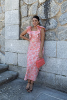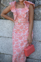 Midi dress with a square neckline and structured ruffles at the shoulders. In coral with an embossed floral print.