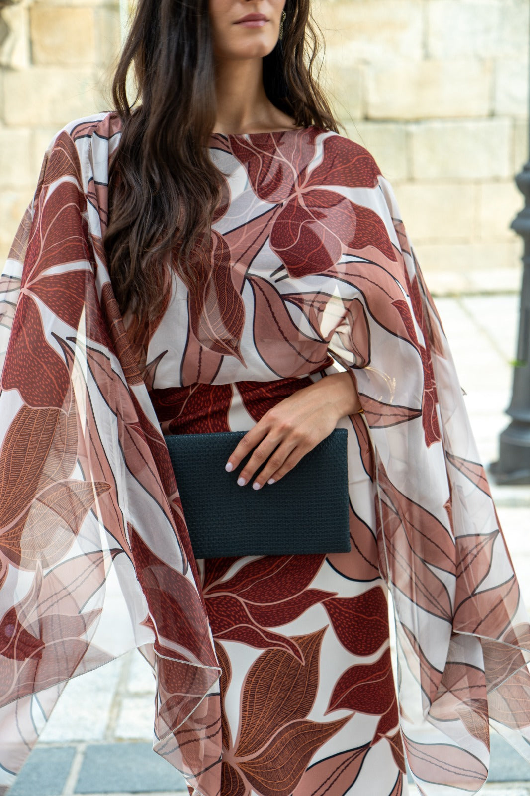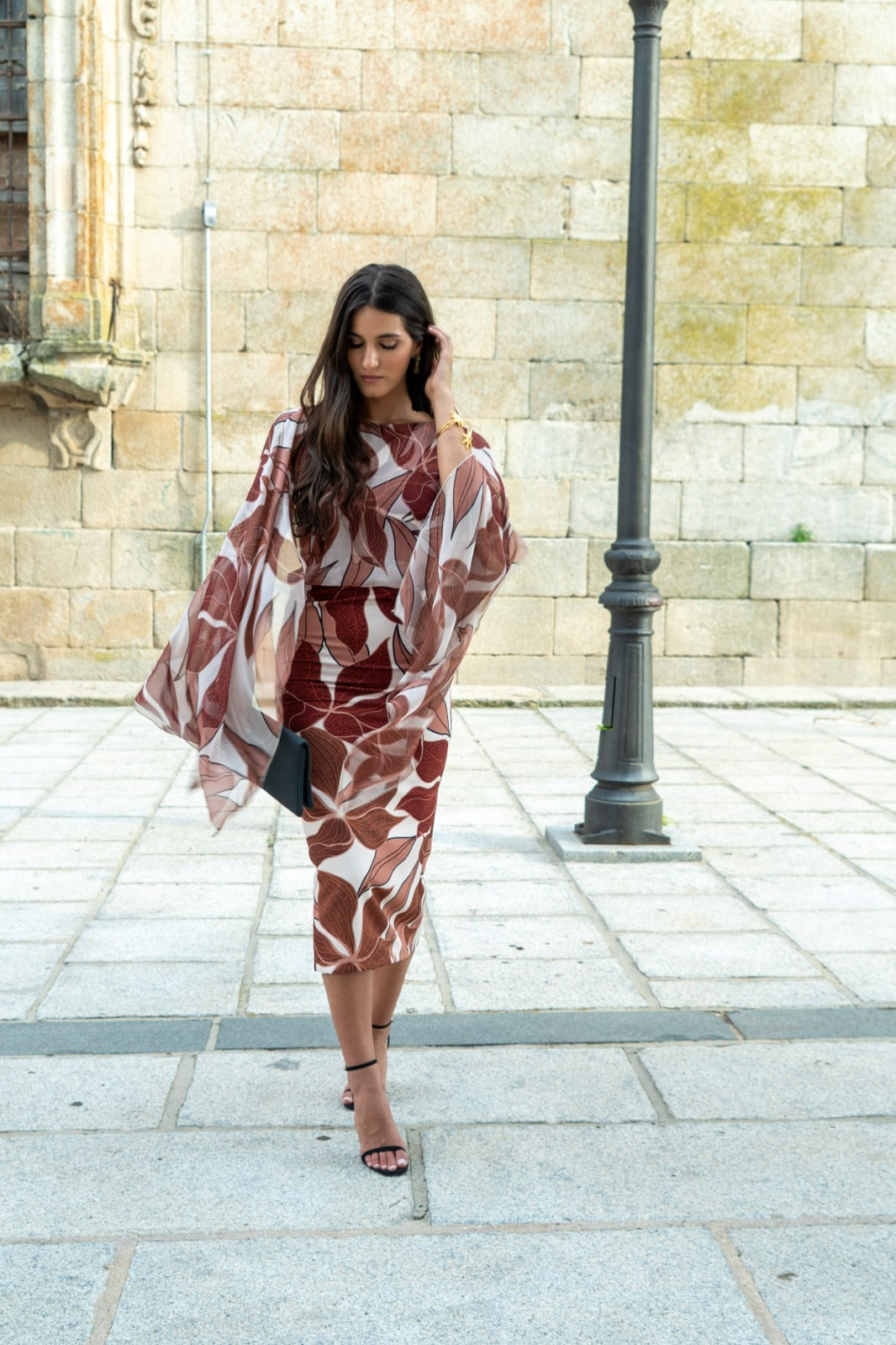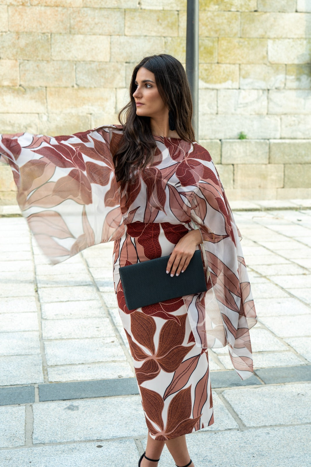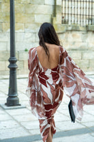 Midi dress, round neckline, back neckline, sleeveless, chiffon sewn into the dress, waistline cut, back slit. In a brown print.