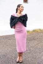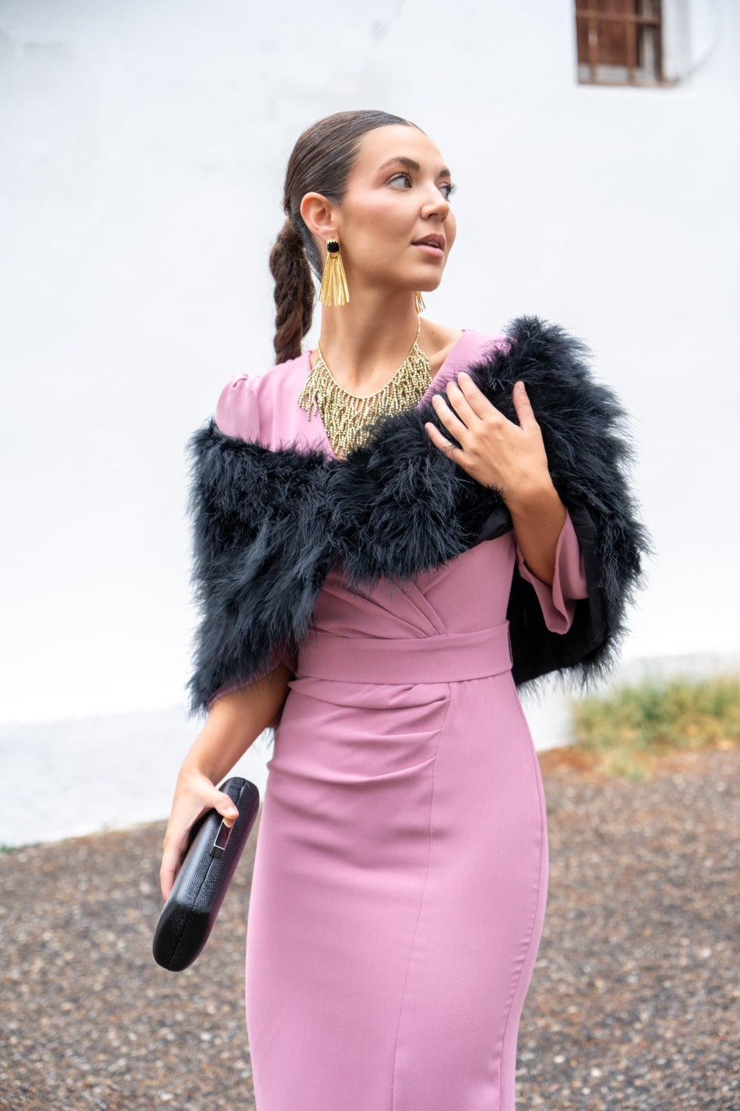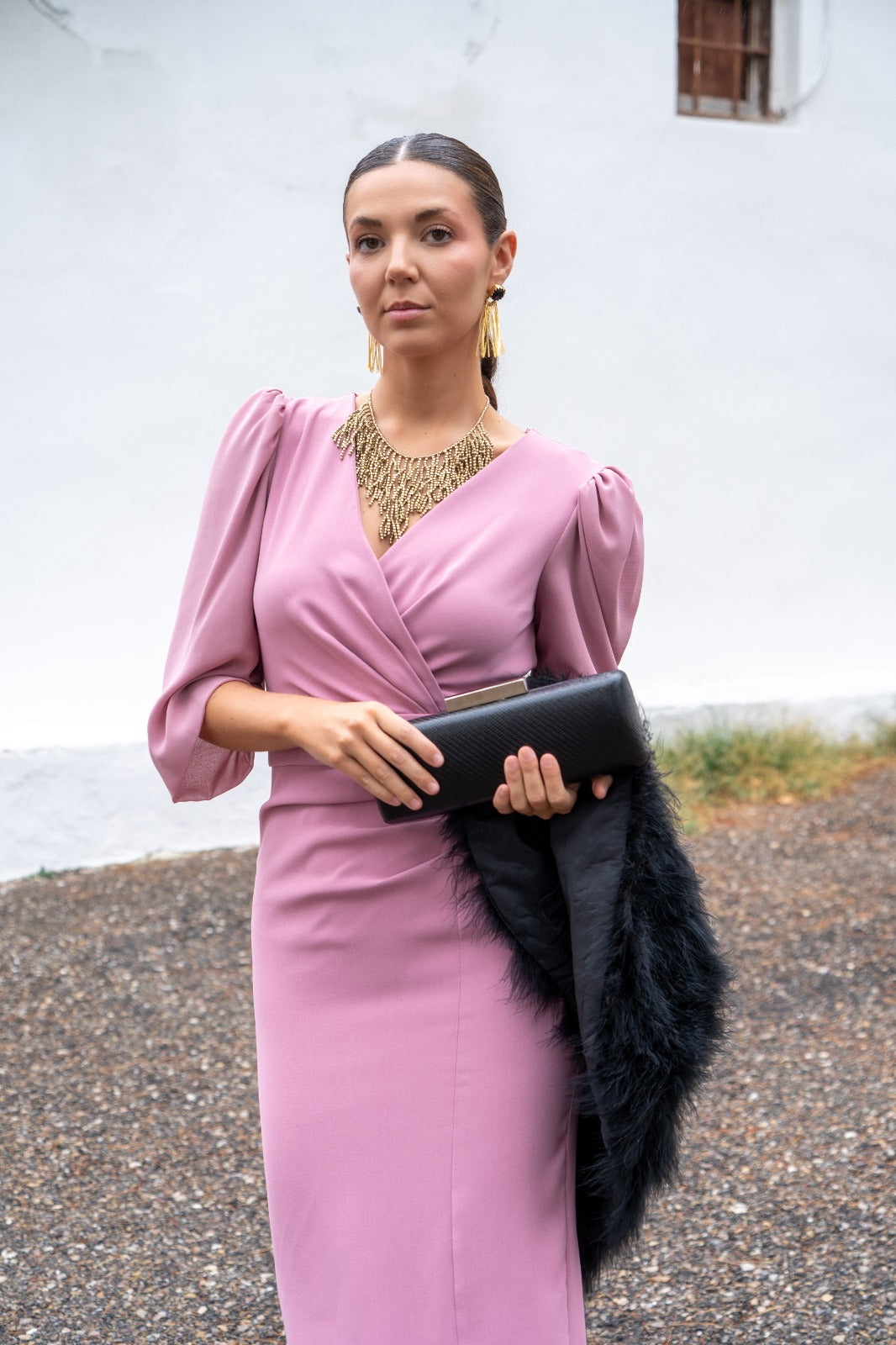 Midi dress, crossover neckline, three-quarter sleeves, pleated waist with belt, side slit. In pink.