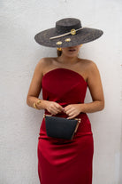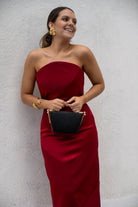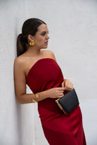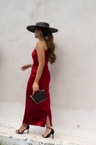 Strapless triacetate midi dress with a curved neckline and cutouts that play with the sheen and matte finish of the fabric itself, and a back slit. In burgundy.