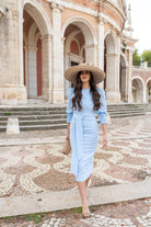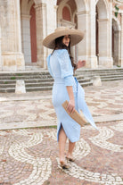 Midi dress, round neckline, plumeti sleeves with gathered cuffs, back slit, belt included. In blue.