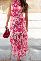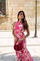 Midi dress with a halterneck and a flower detail at the front, a cutout at the waist, a ruffle at the bottom, and a side slit. Pink and white print.