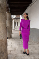 Midi dress with a round neckline, French sleeves, and back slit. In pink with black details.