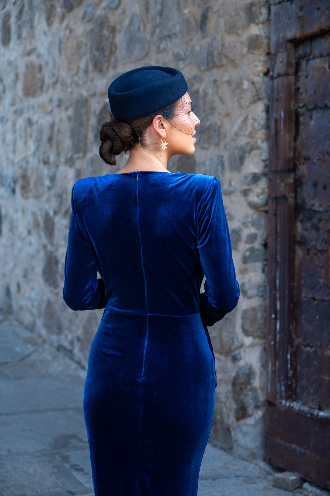 Midi dress with a V-neck in sheer fabric, long sleeves, a knot at the waist, and a front slit. In blue velvet. Perfect to pair with our ZAMIA cape.