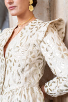 This set includes a fitted jacket with a V-neck and structured shoulders. It features detachable sleeves with an invisible zipper at the armhole, allowing the garment to be transformed into a vest. The trousers are straight-leg with side pockets and pleats. The ivory embroidery features delicate raised floral motifs.