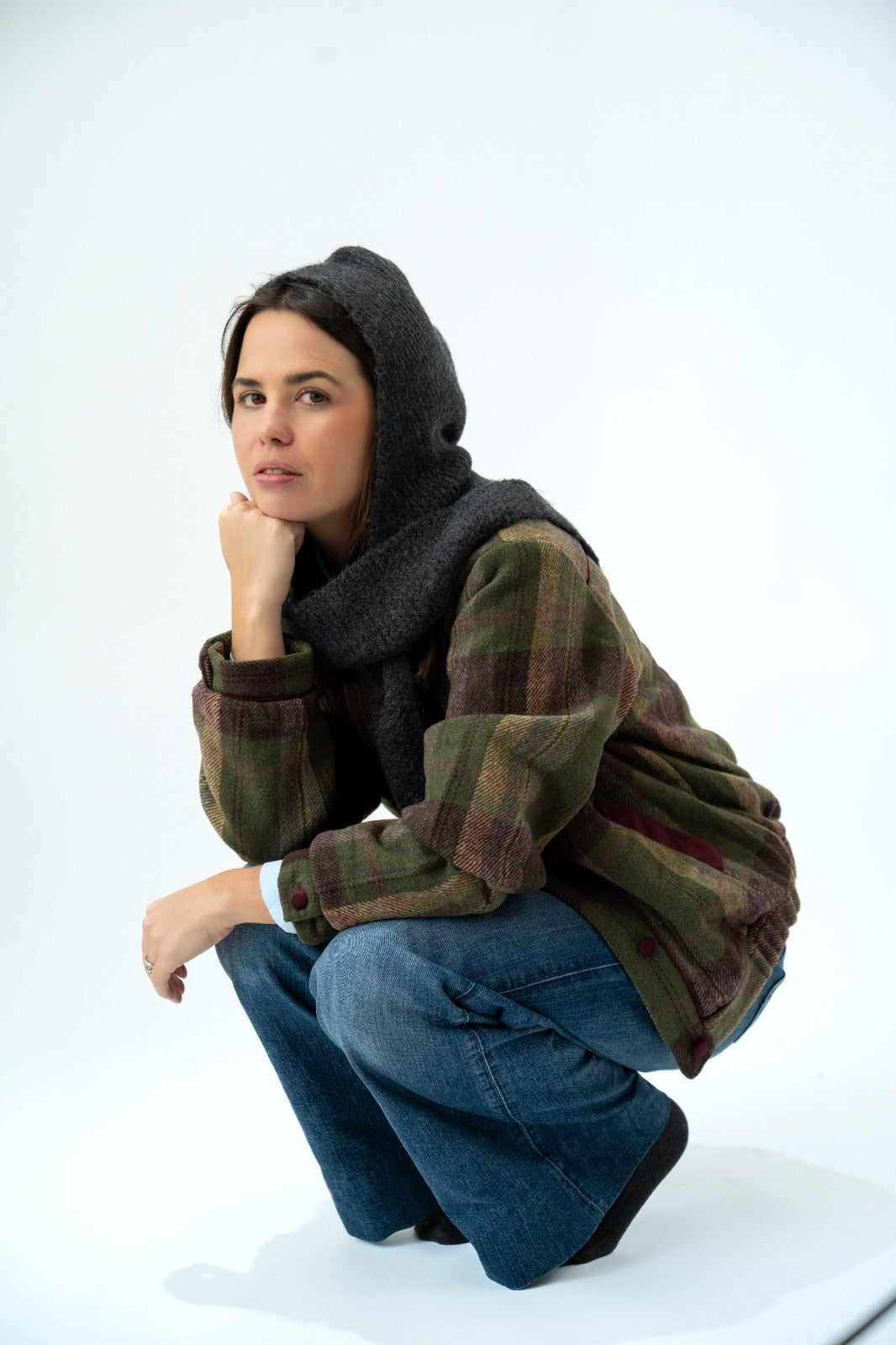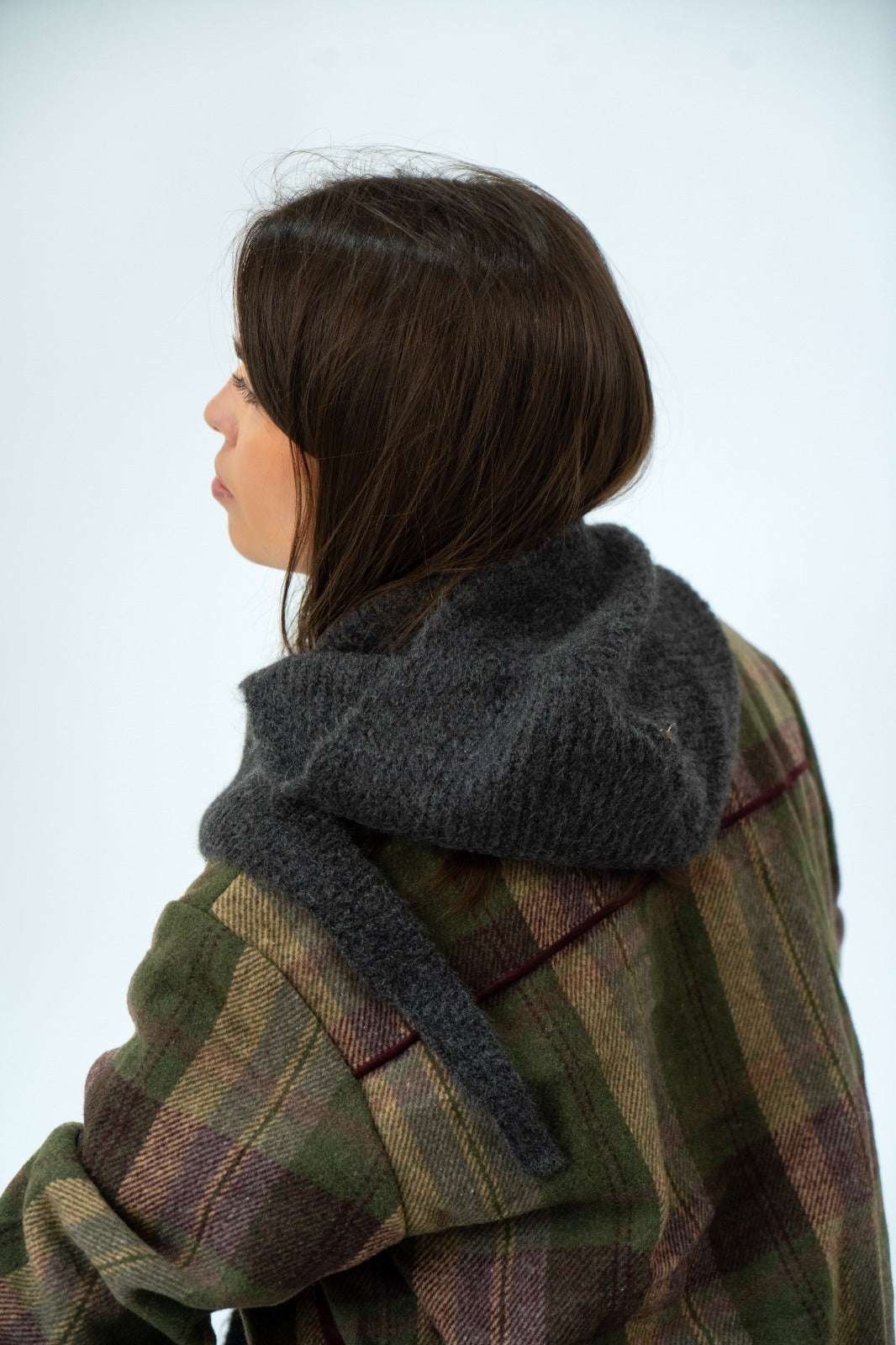 Combination of a scarf with pointed ends and a wool hood, in grey.