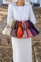 Bag with a round curly handle, lined in natural silk, in beige.
