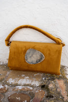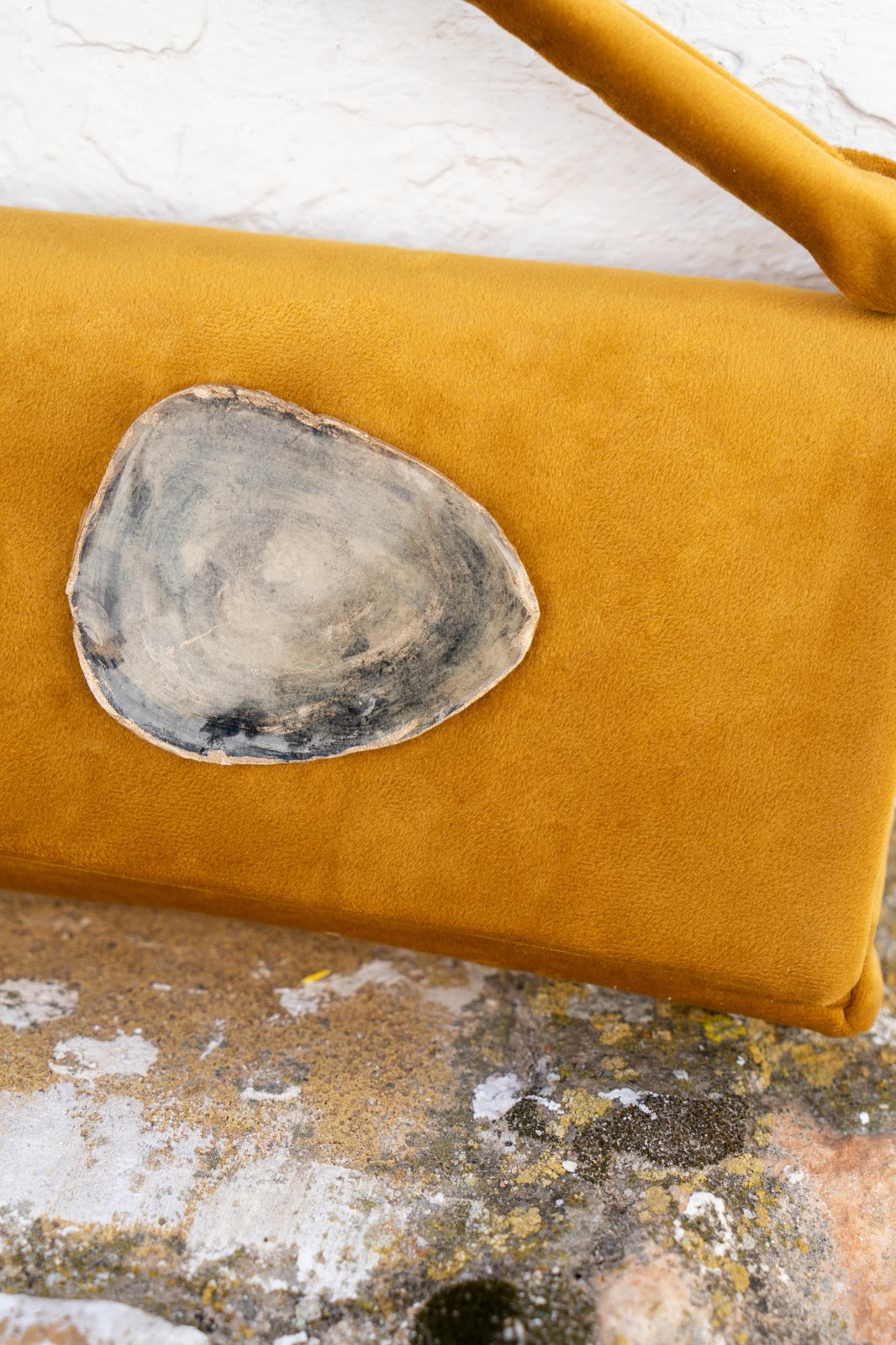Long bag, in soft fabric, beige detail in the center, magnetic closure, short handle. In mustard color.