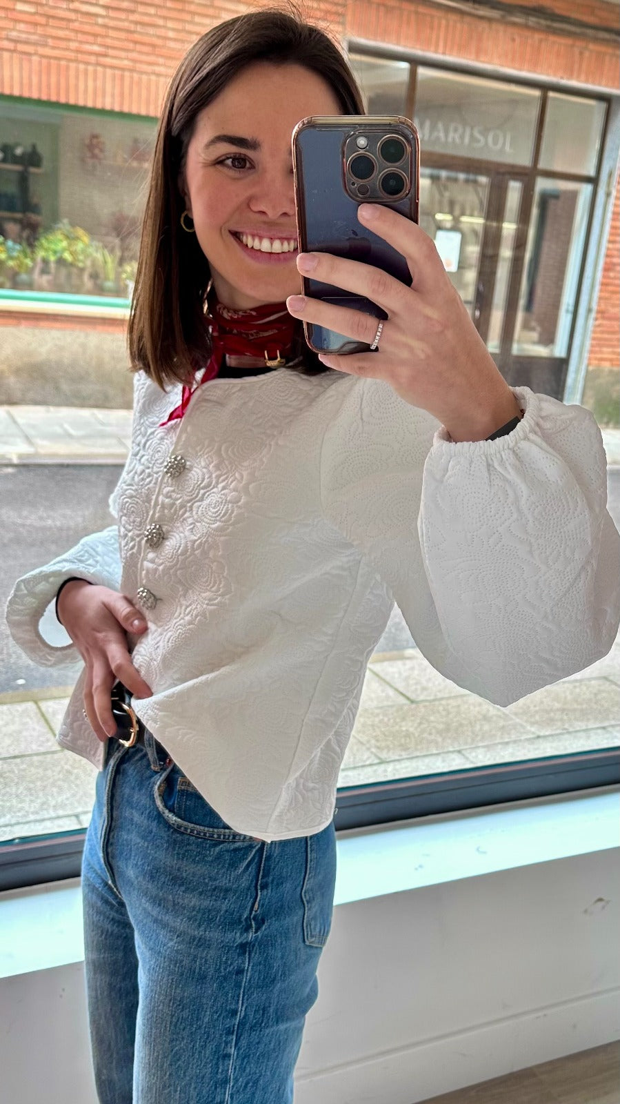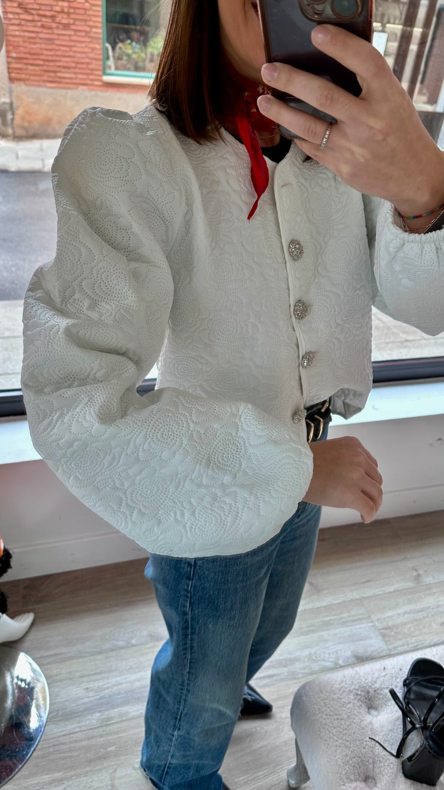 Round-neck jacket with long puffed sleeves and elastic cuffs. In white with a pattern.