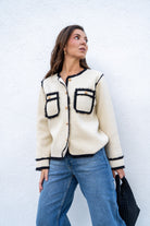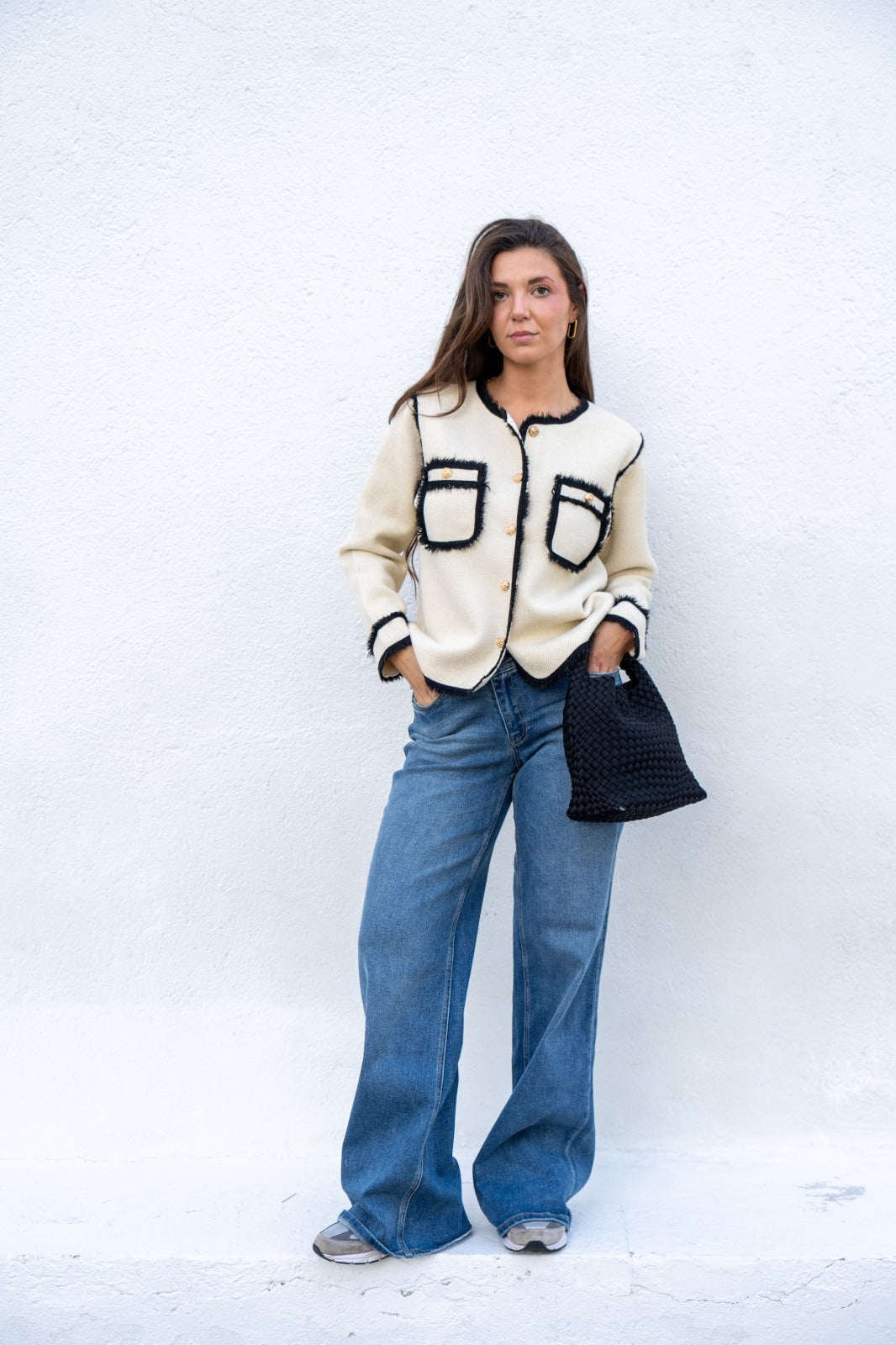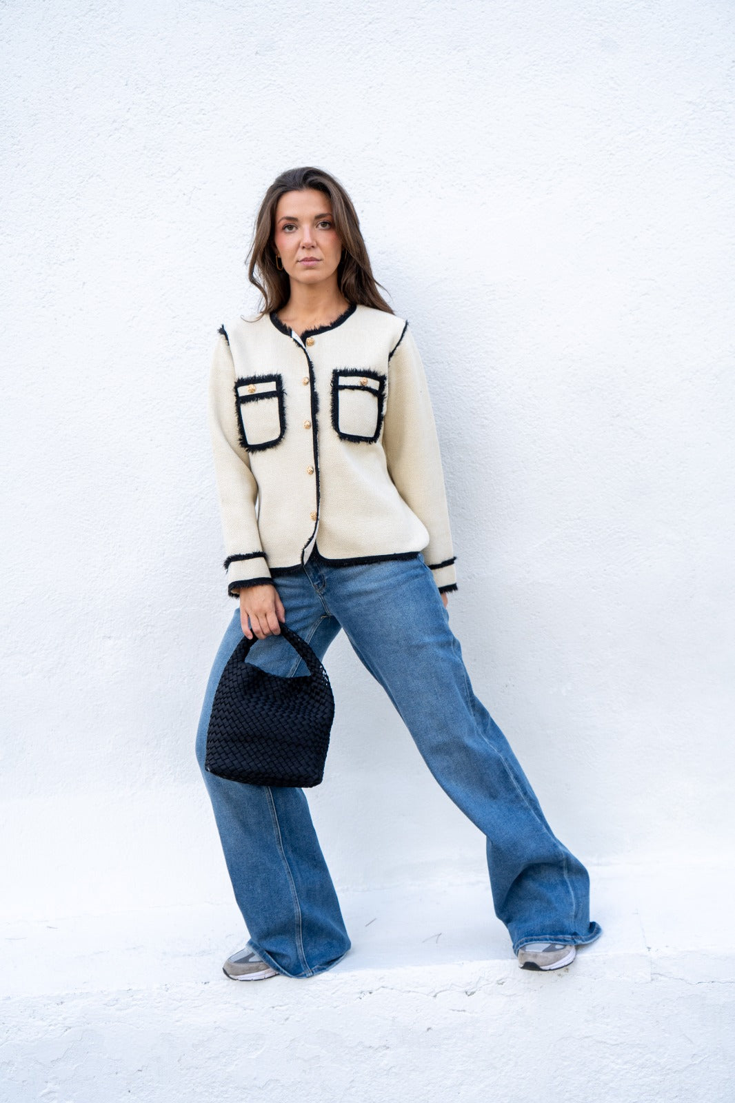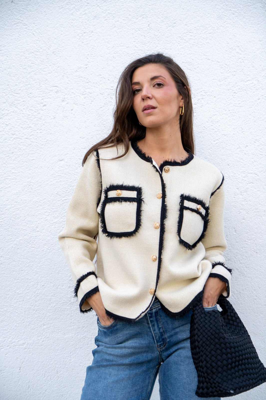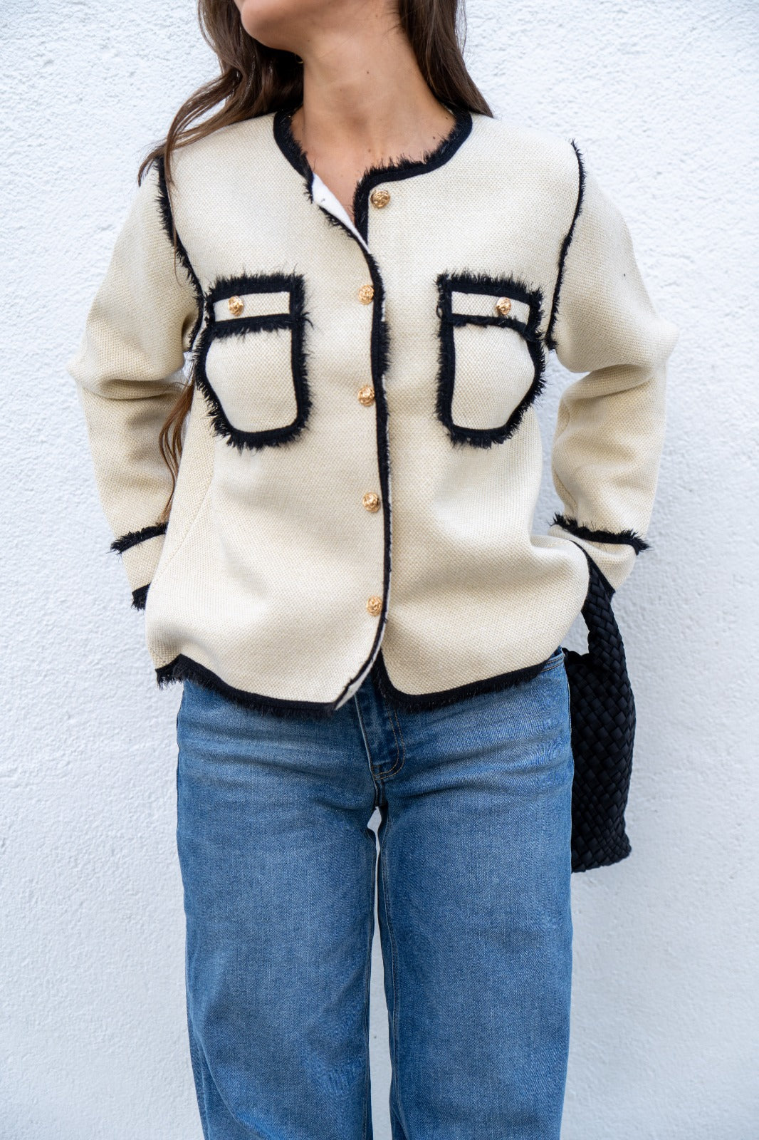 Short jacket, round neckline, long sleeves, buttoned, front pockets. In beige with black details and gold lurex.