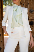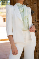 Blazer jacket, three-quarter sleeves, center-button closure, and canted shoulder pad. In white.