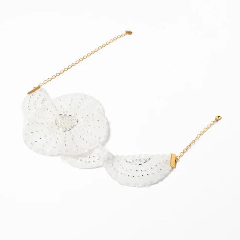 Choker with perfectly embroidered circular petals. The clean, contemporary design combines the delicacy of the embroidery with a powerful visual structure, creating a piece with a serene personality.