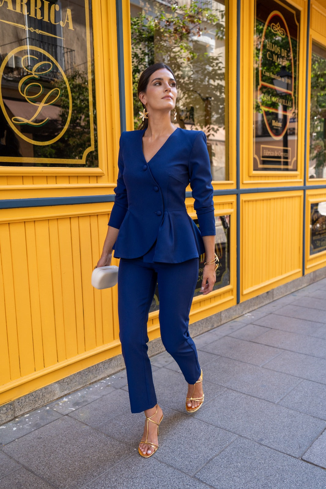 Set consisting of a long-sleeved, double-breasted jacket with buttons and peplum detail. High-waisted trousers with a waistband. In blue.