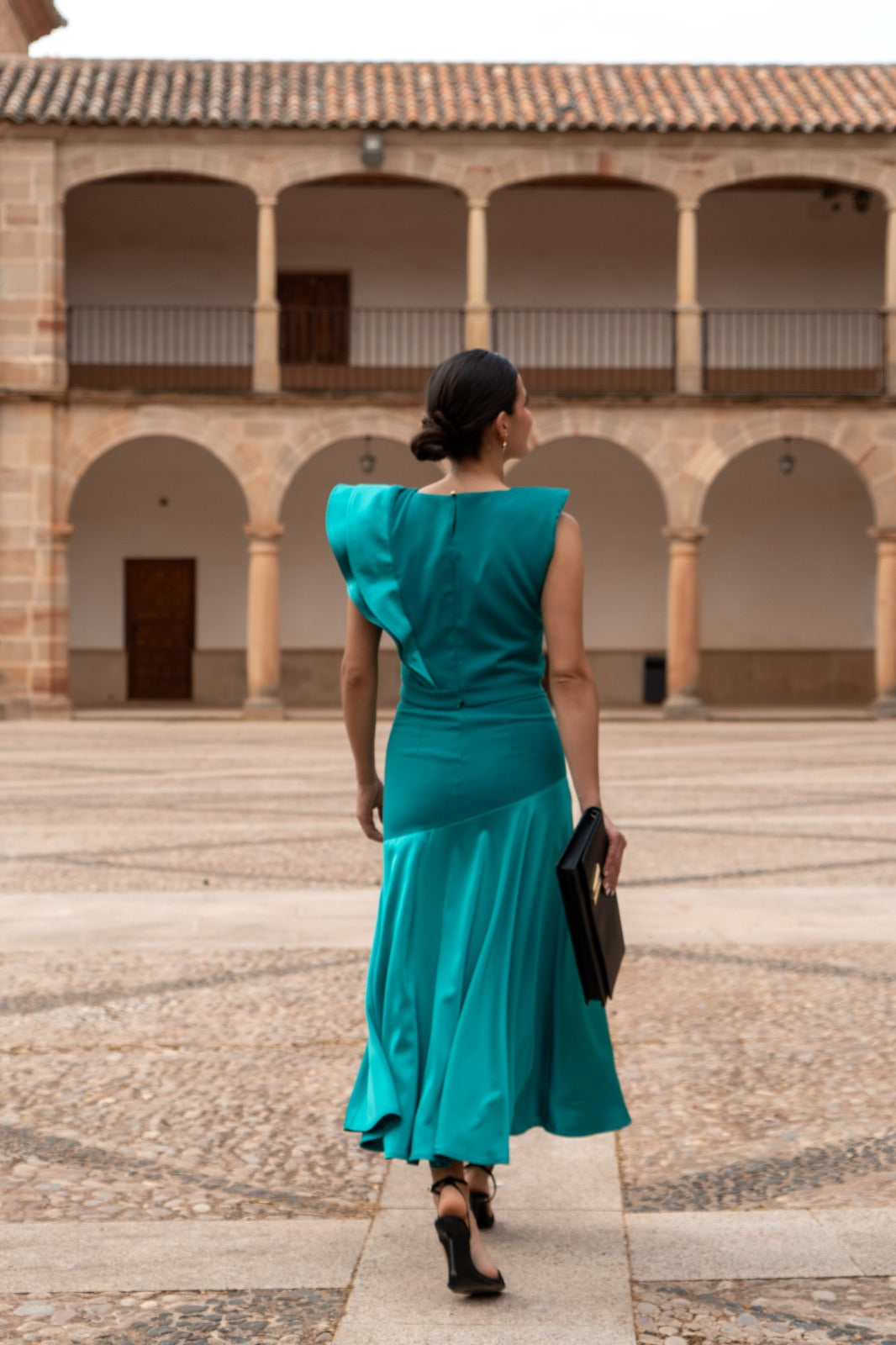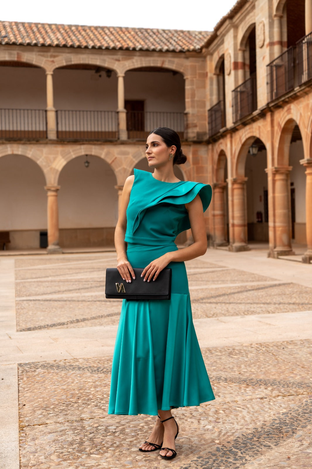 Set consisting of a round-neck, sleeveless top with a ruffle on one side, and a slim skirt with a flare at the bottom. In a combination of green fabrics.