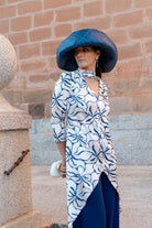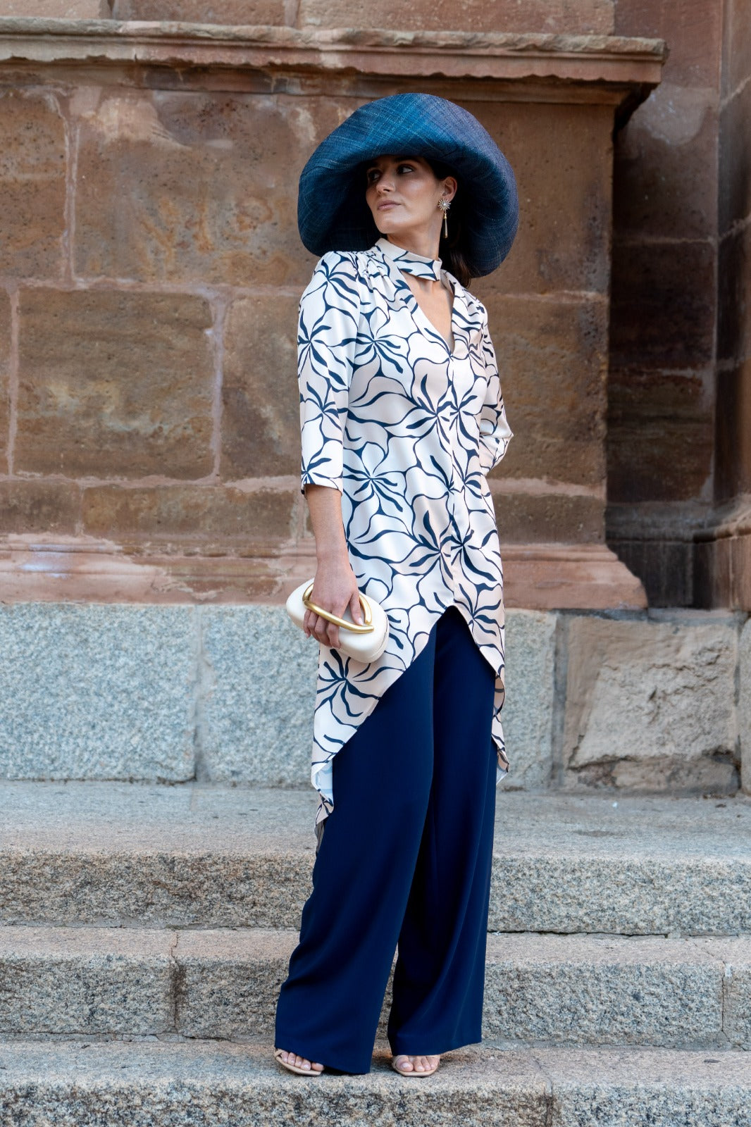 Conjunto compuesto por casaca escote a pico y tira pegado al cuello, manga francesa, desigual, mas largo por detrás y pantalón, cintura, recto. En color beige y azul marino.
