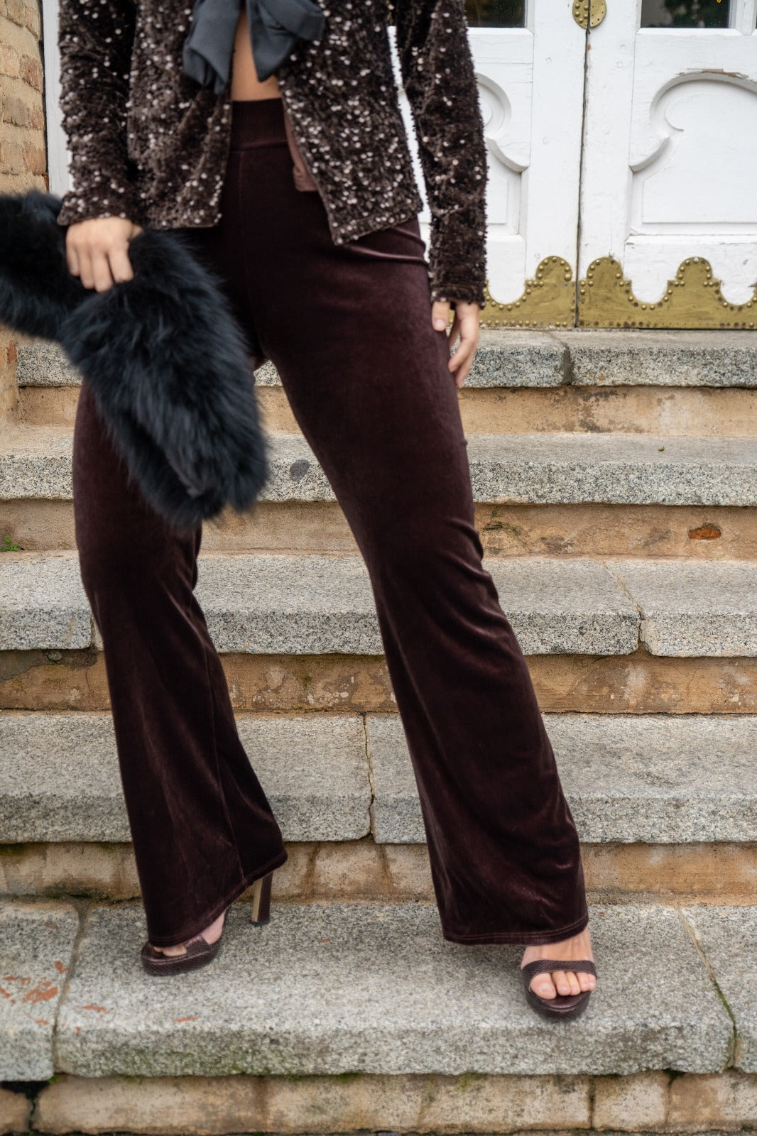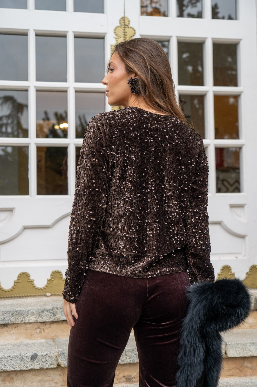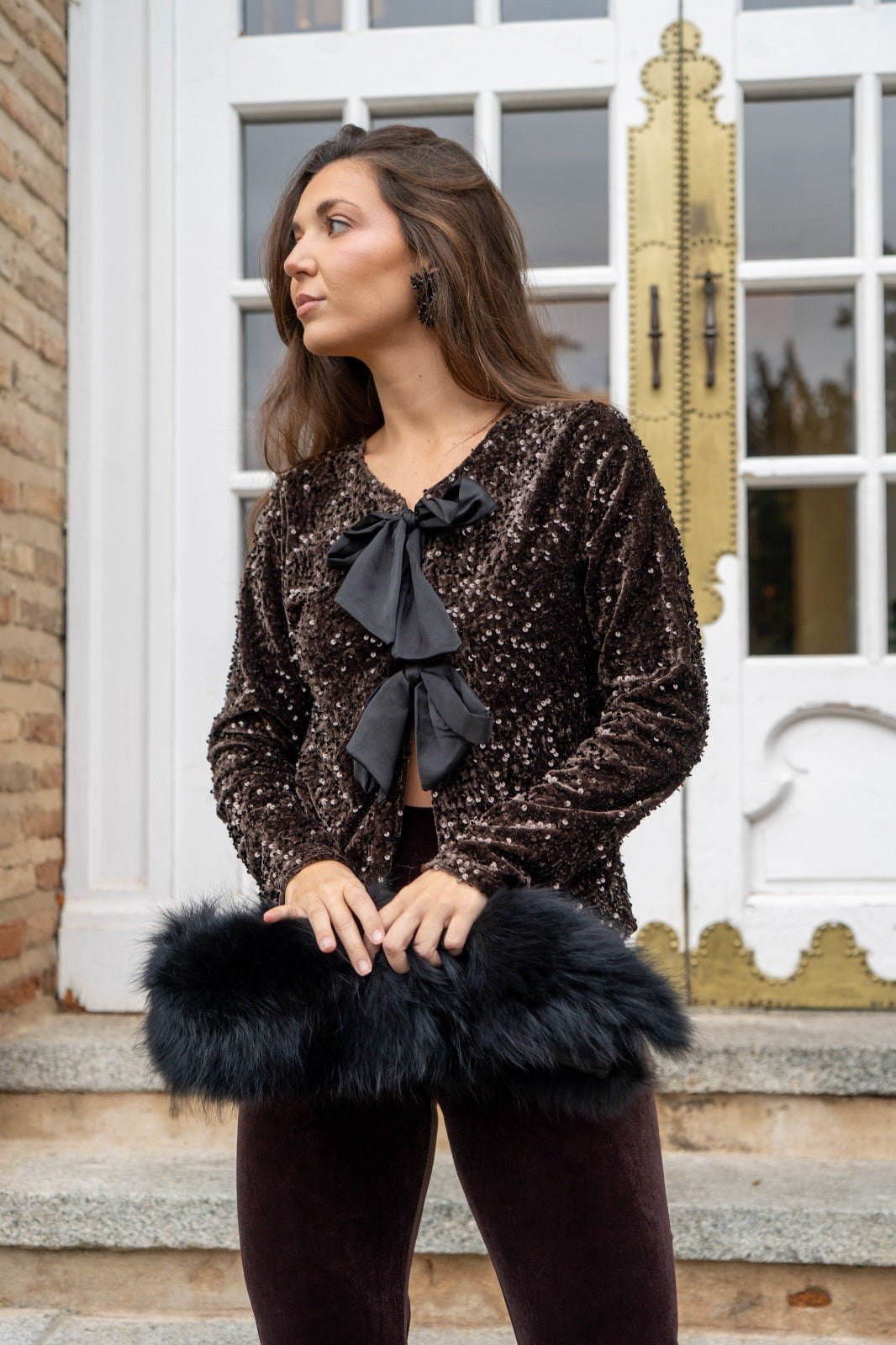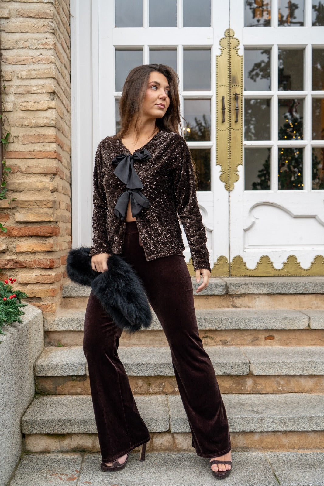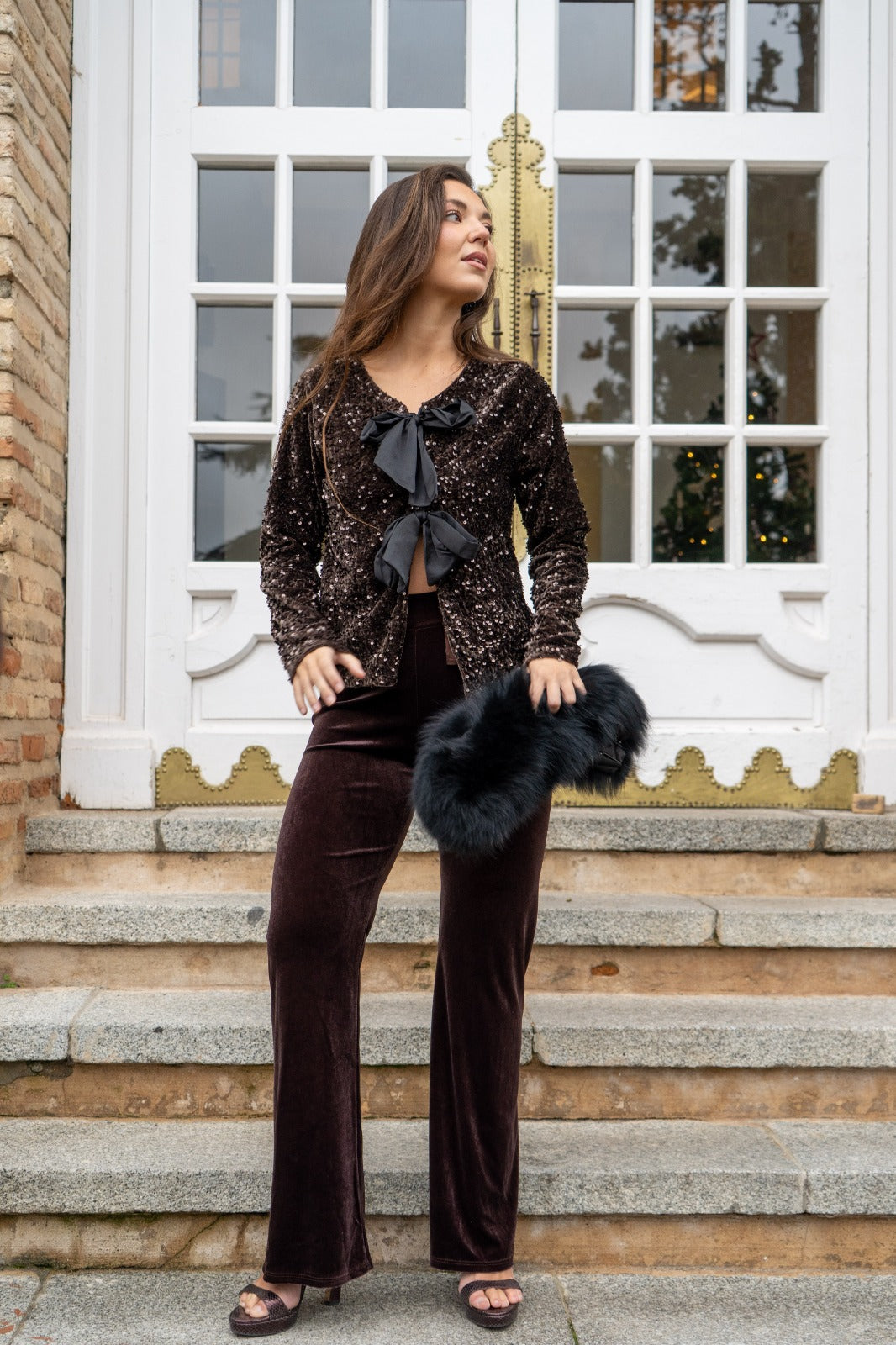Conjunto compuesto por blusa, escote a pico, manga larga, abrochada con lazos y lentejuelas negras. Pantalón cintura engomada, ancho, en terciopelo marrón.