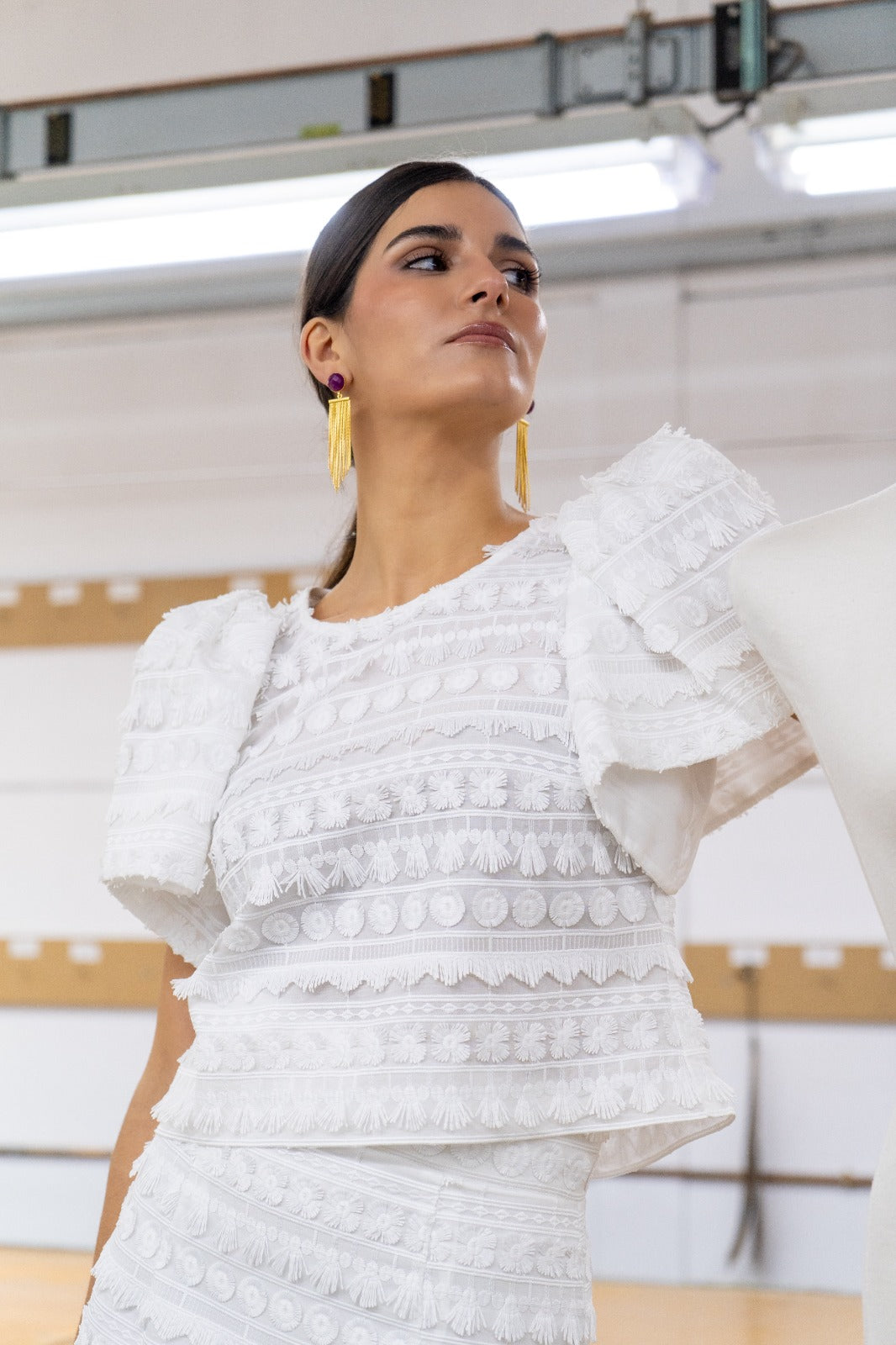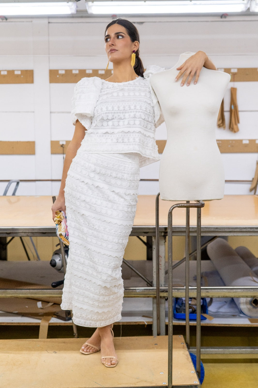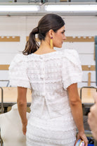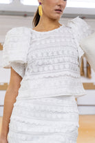 Set consisting of a blouse with a round neckline and short sleeves, and a high-waisted skirt with a back slit. In white.