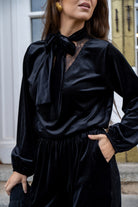 Set consisting of a blouse, V-neck with lace trim, long sleeves with elasticated cuffs and harem pants, elasticated waist, lace trim on the sides, in black.