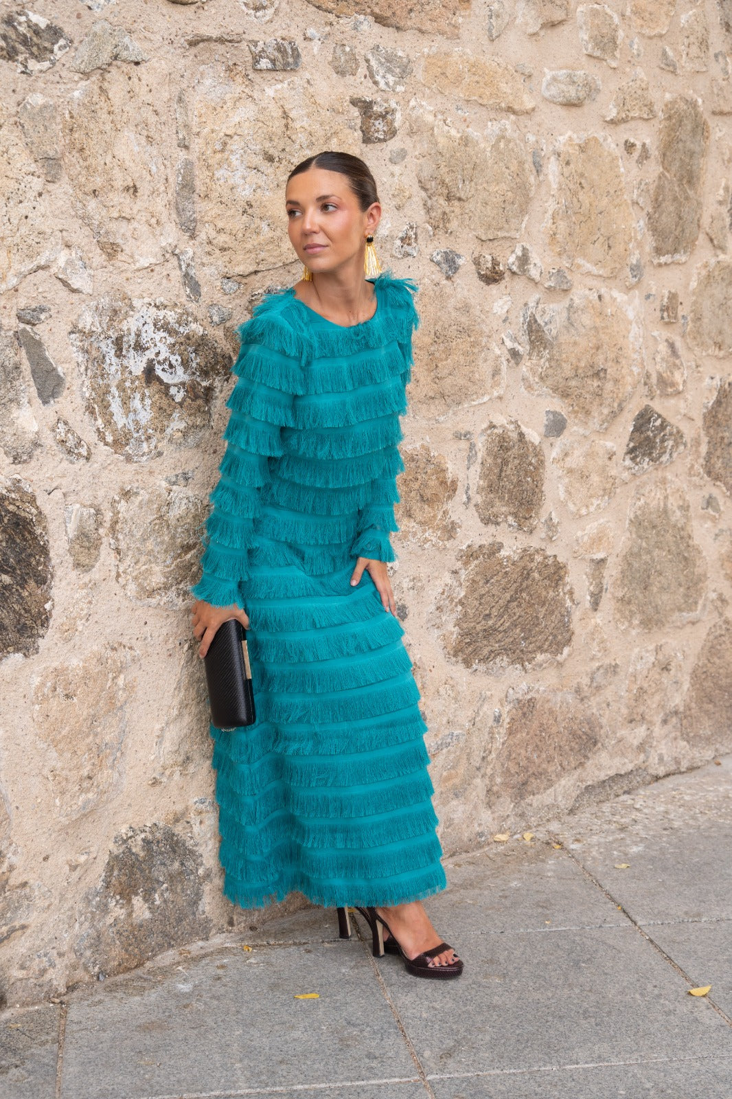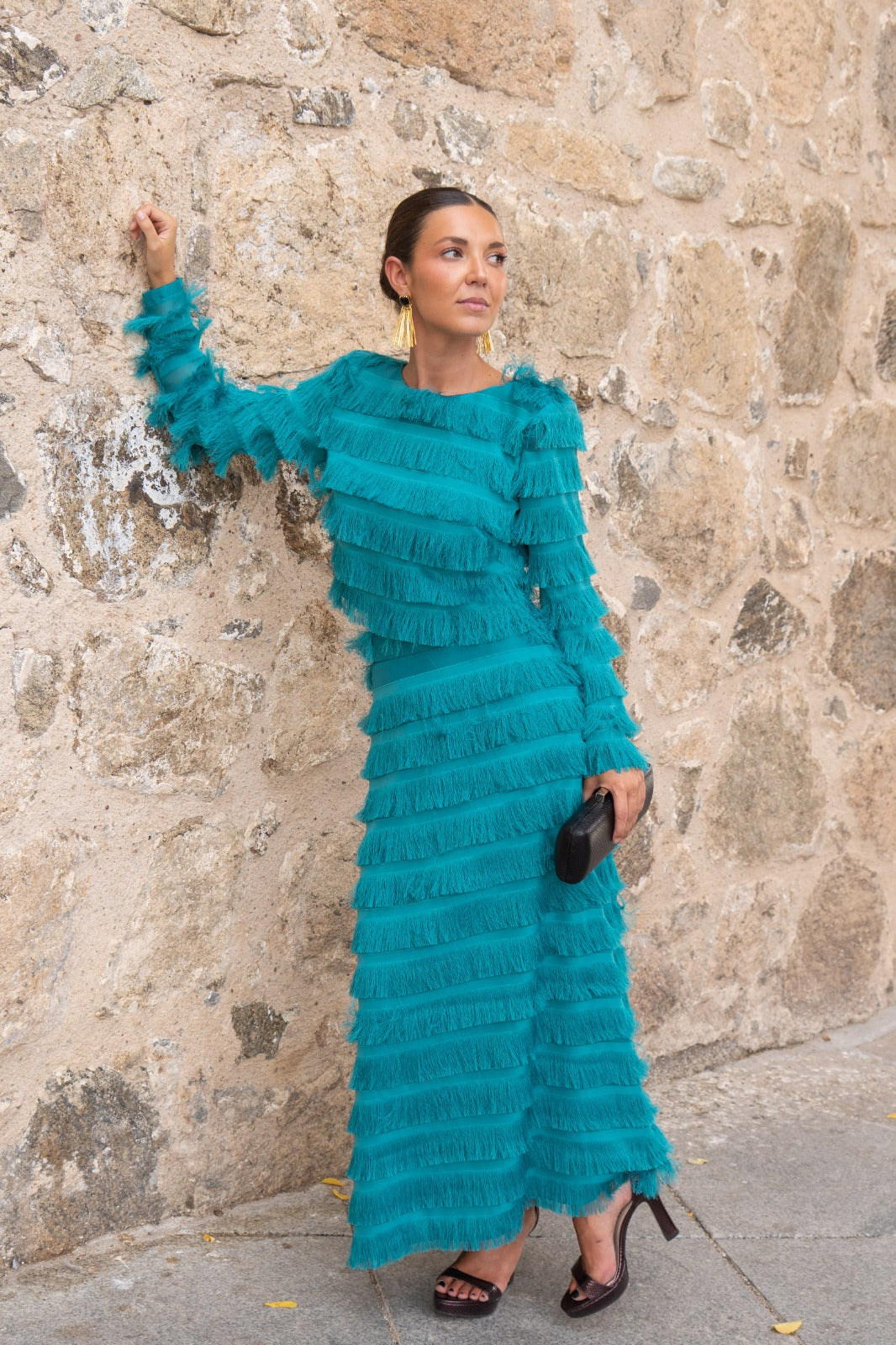 Set consisting of a round-neck, long-sleeved top and a high-waisted, A-line skirt. With green fringe.