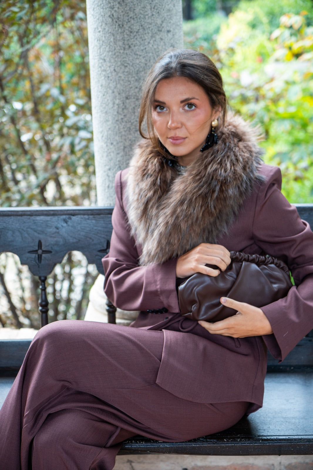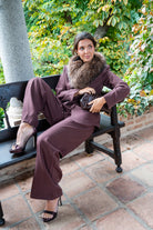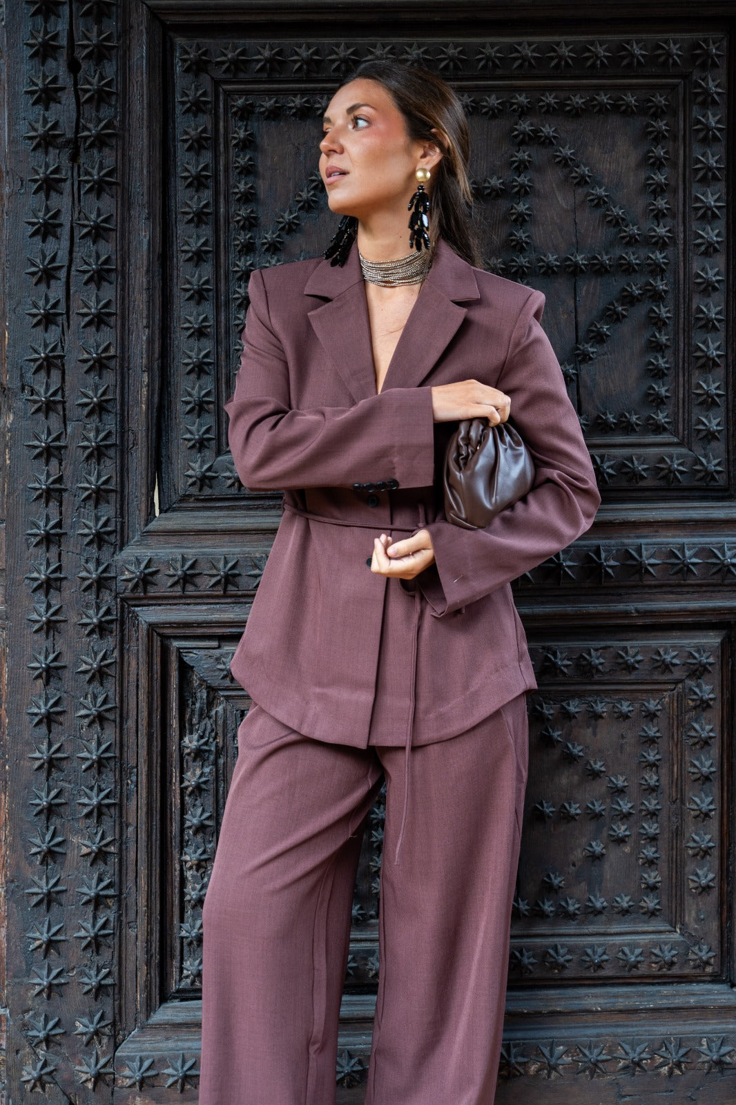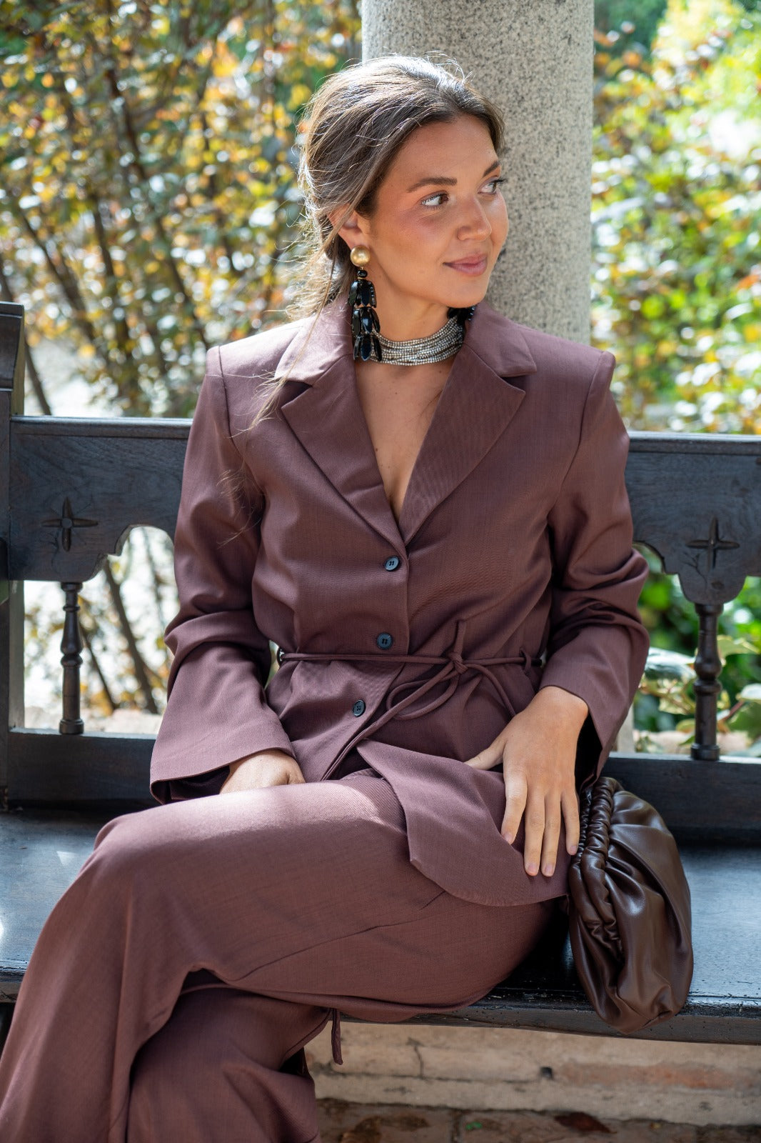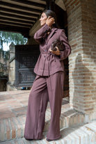 Suit consisting of a blazer with a notched lapel, button-front closure, and drawstring belt, and wide-legged trousers with front pleats and side pockets. In brown.