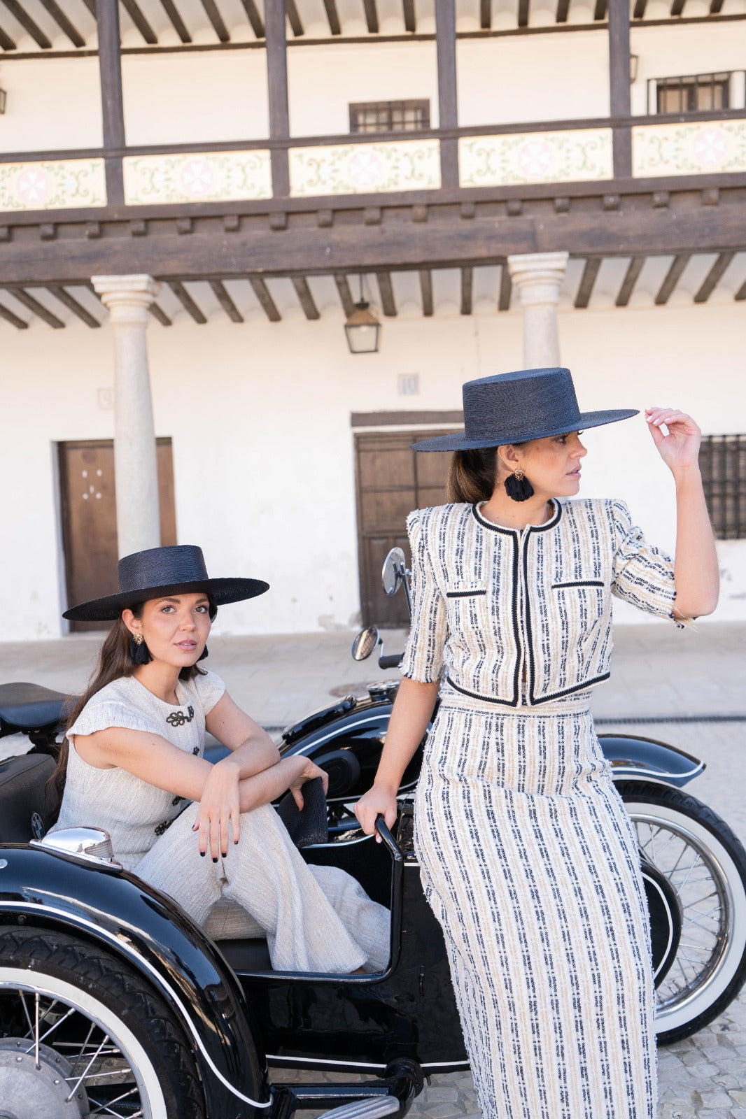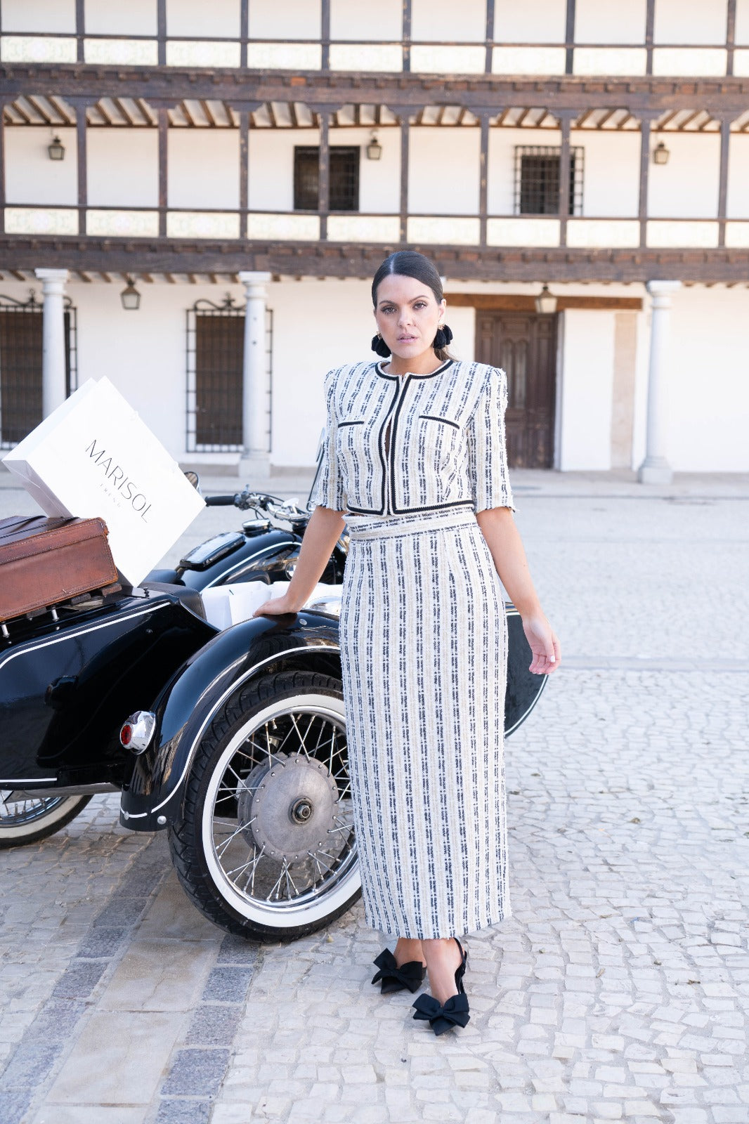 Set featuring a tweed top with short sleeves and contrasting piping details, along with a tweed pencil skirt. In beige with a gold lurex print.