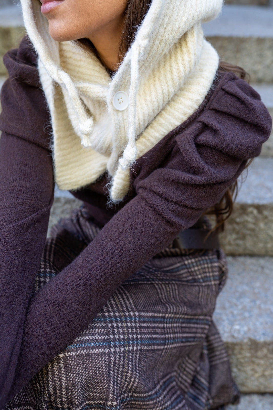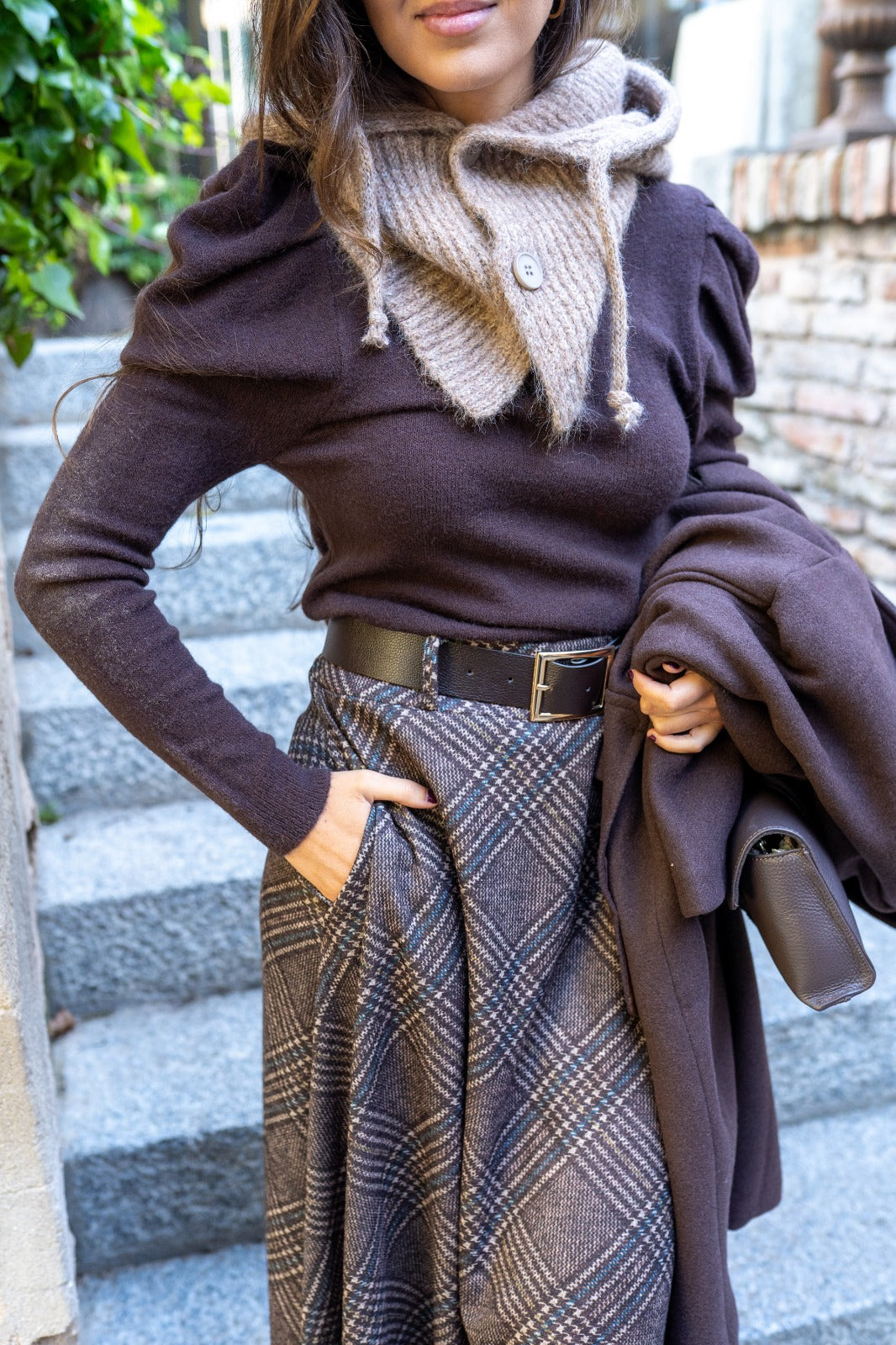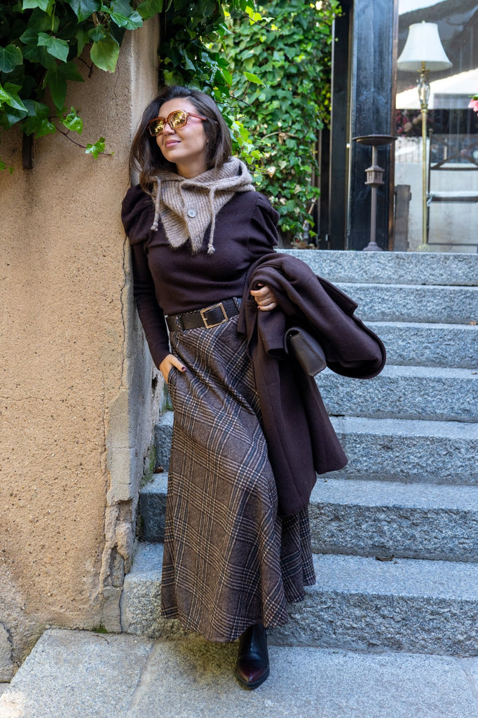 Jersey suave, manga larga, escote redondo, manga abullonada, en color marrón.