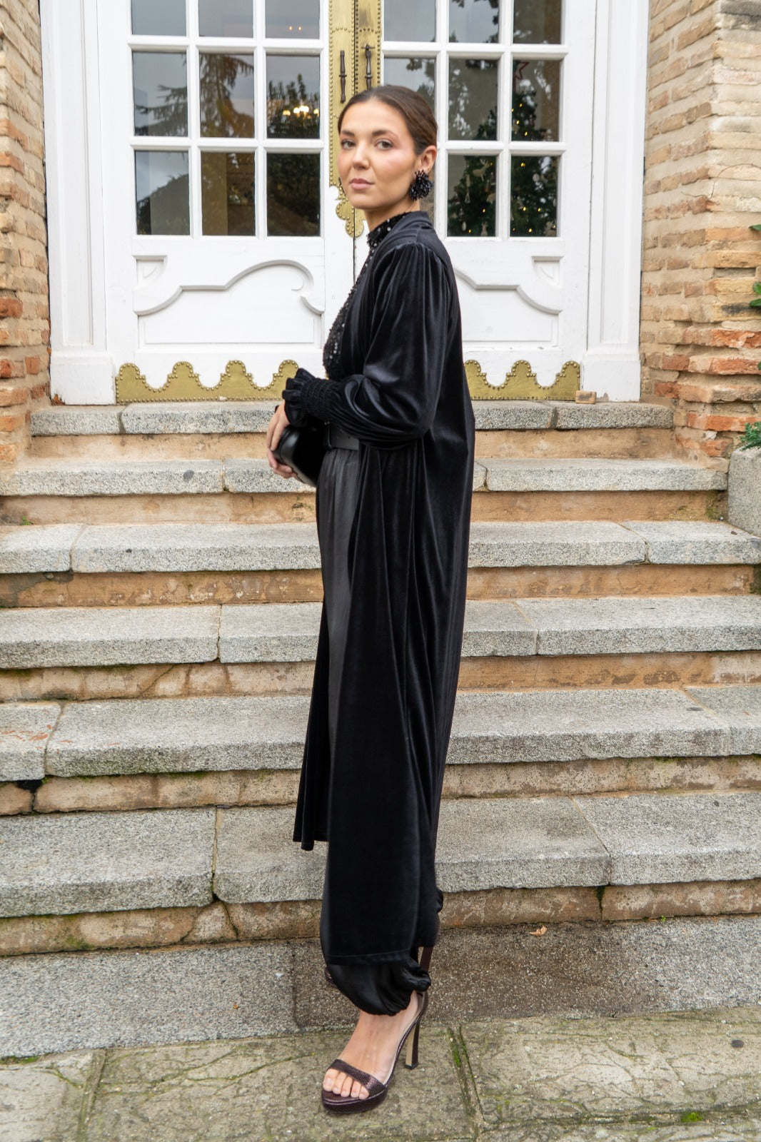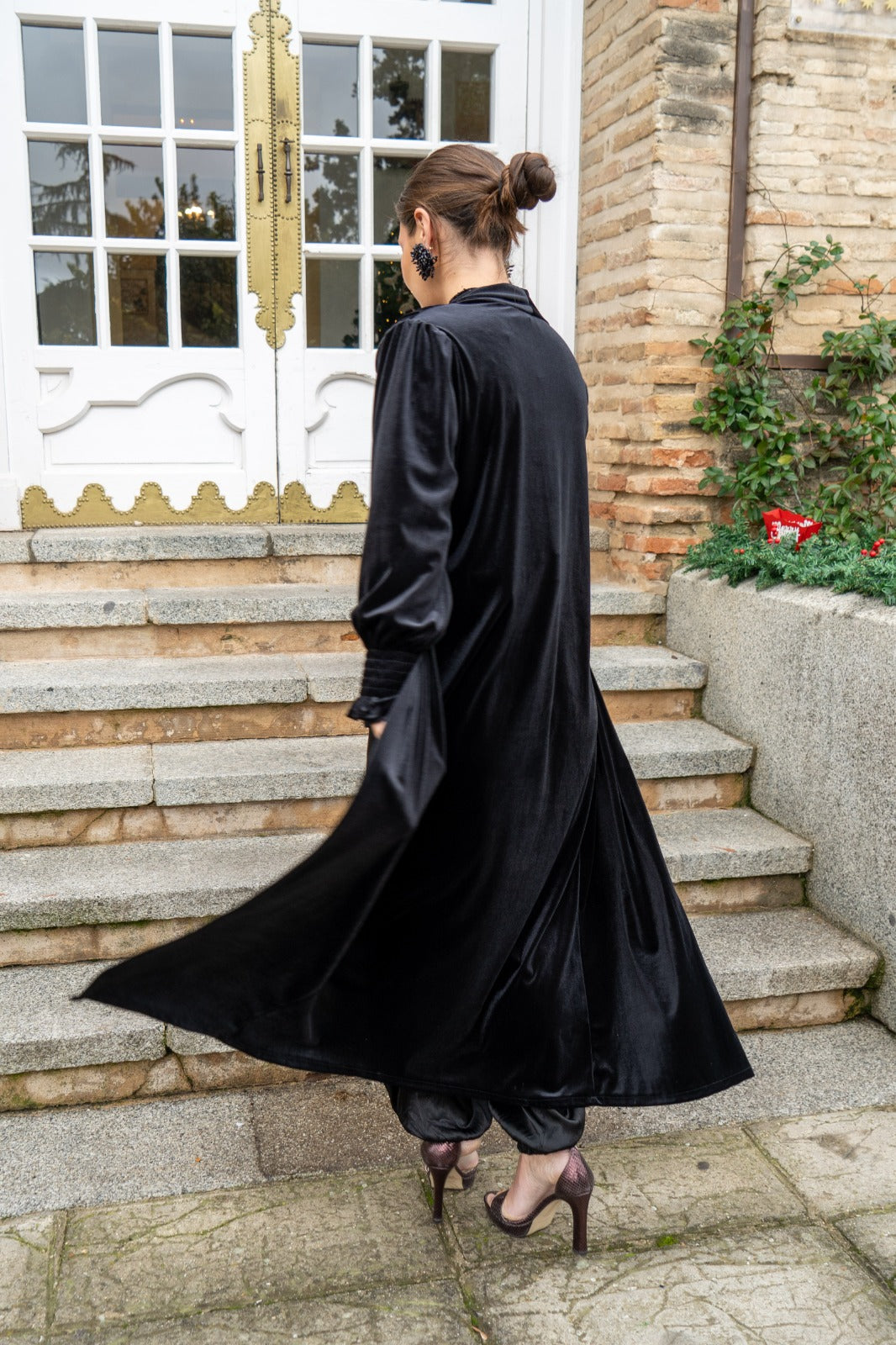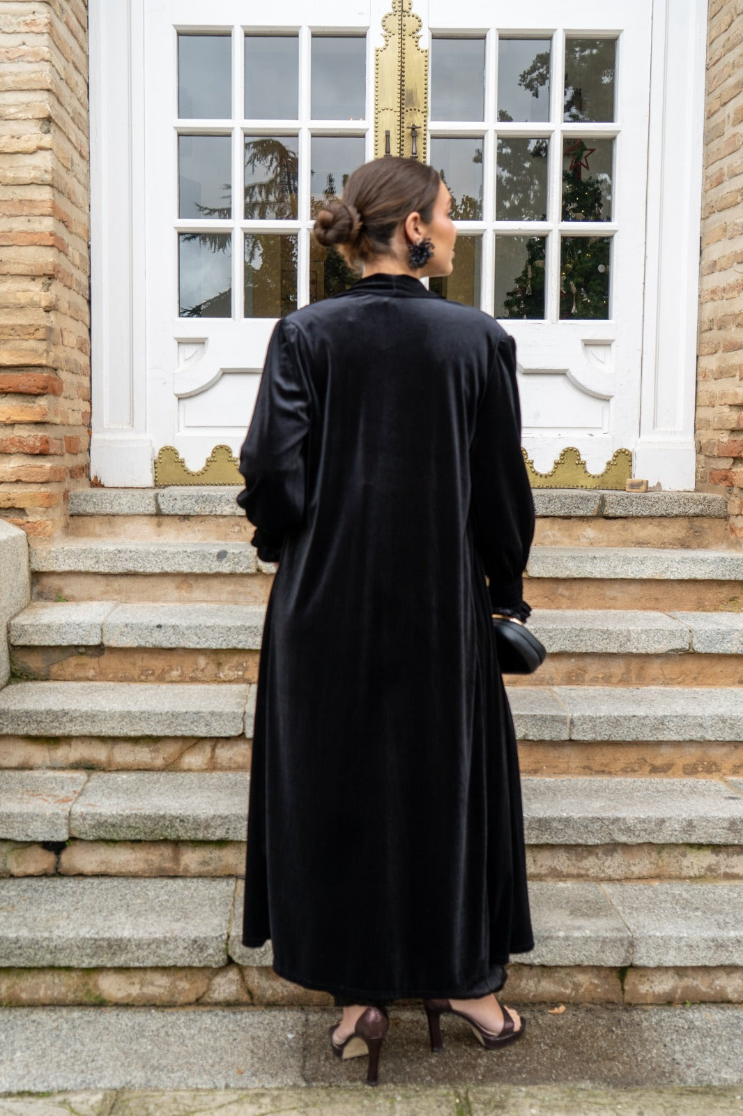 Abrigo en terciopelo, manga fruncida con hombrera, puño engomado. En color negro.