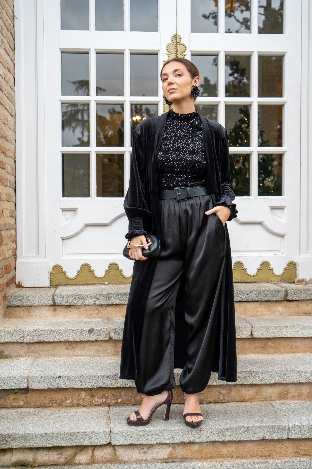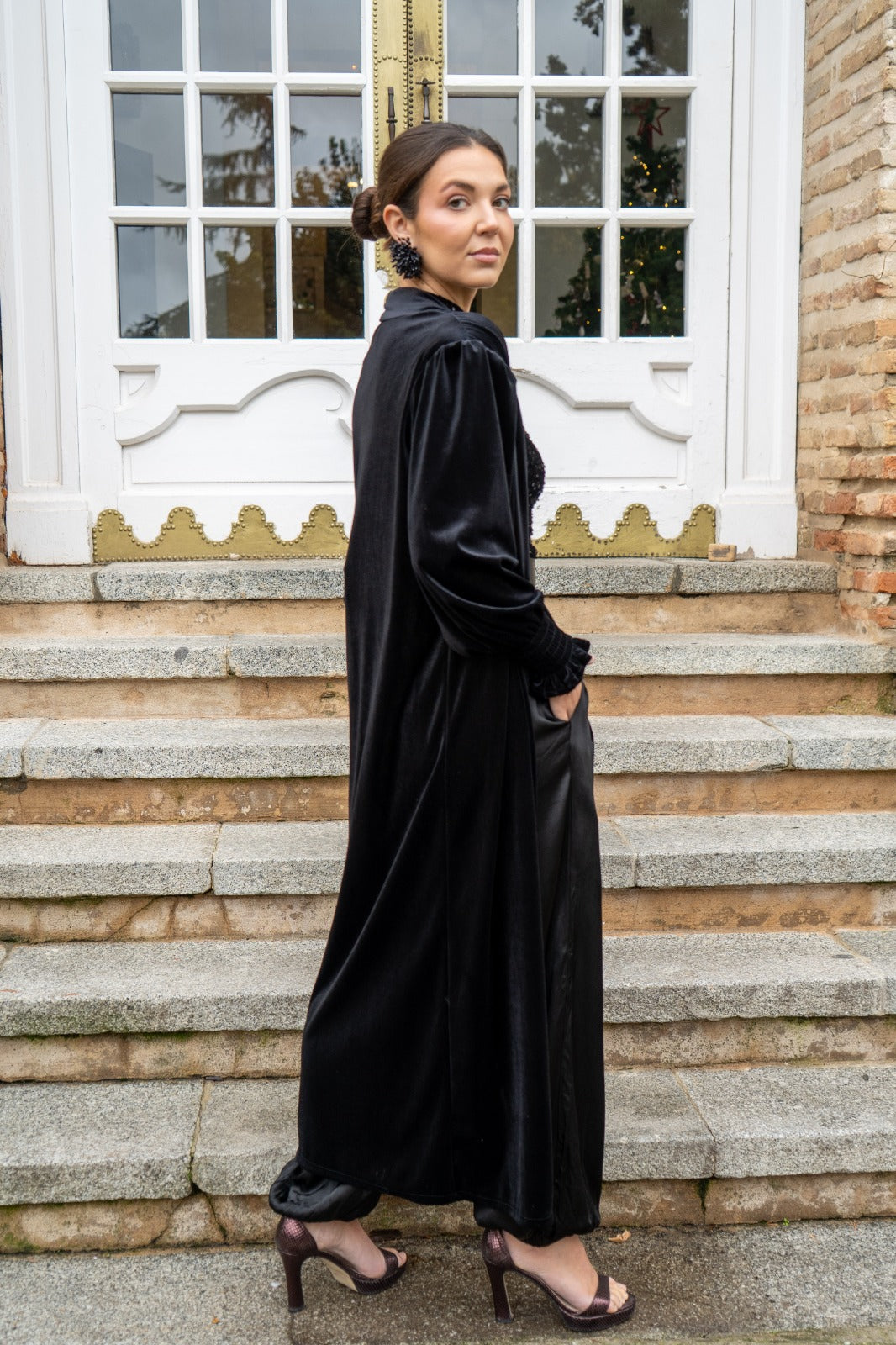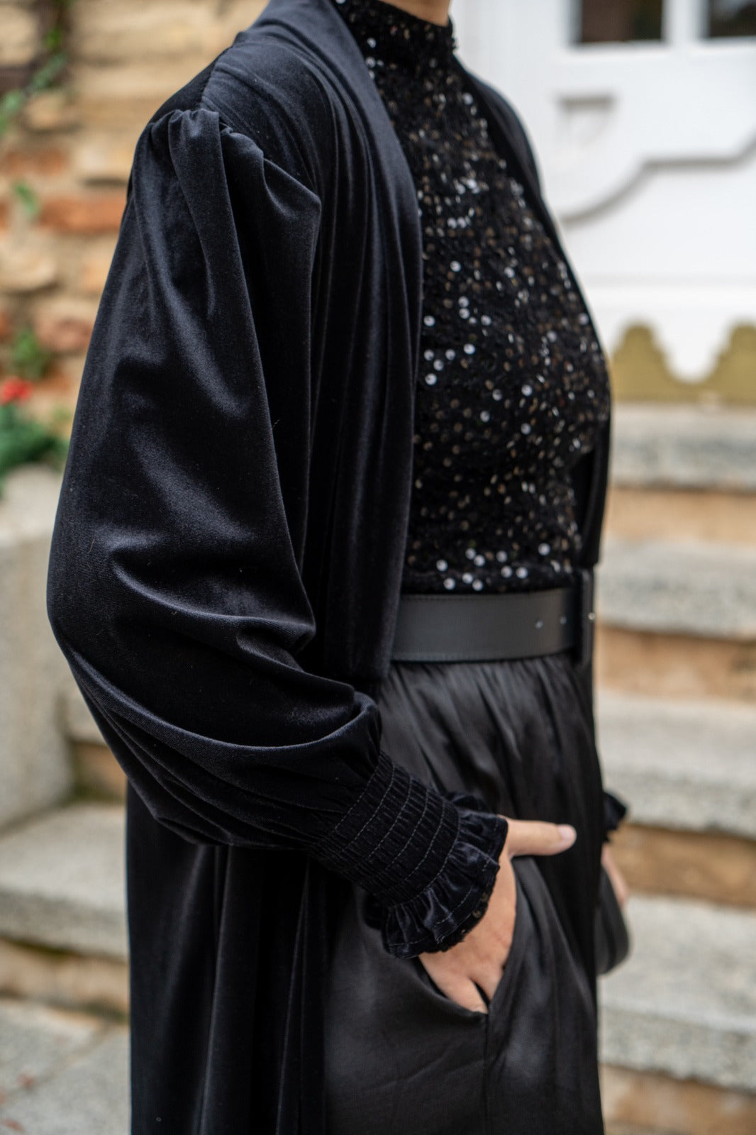 Abrigo en terciopelo, manga fruncida con hombrera, puño engomado. En color negro.