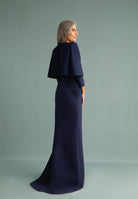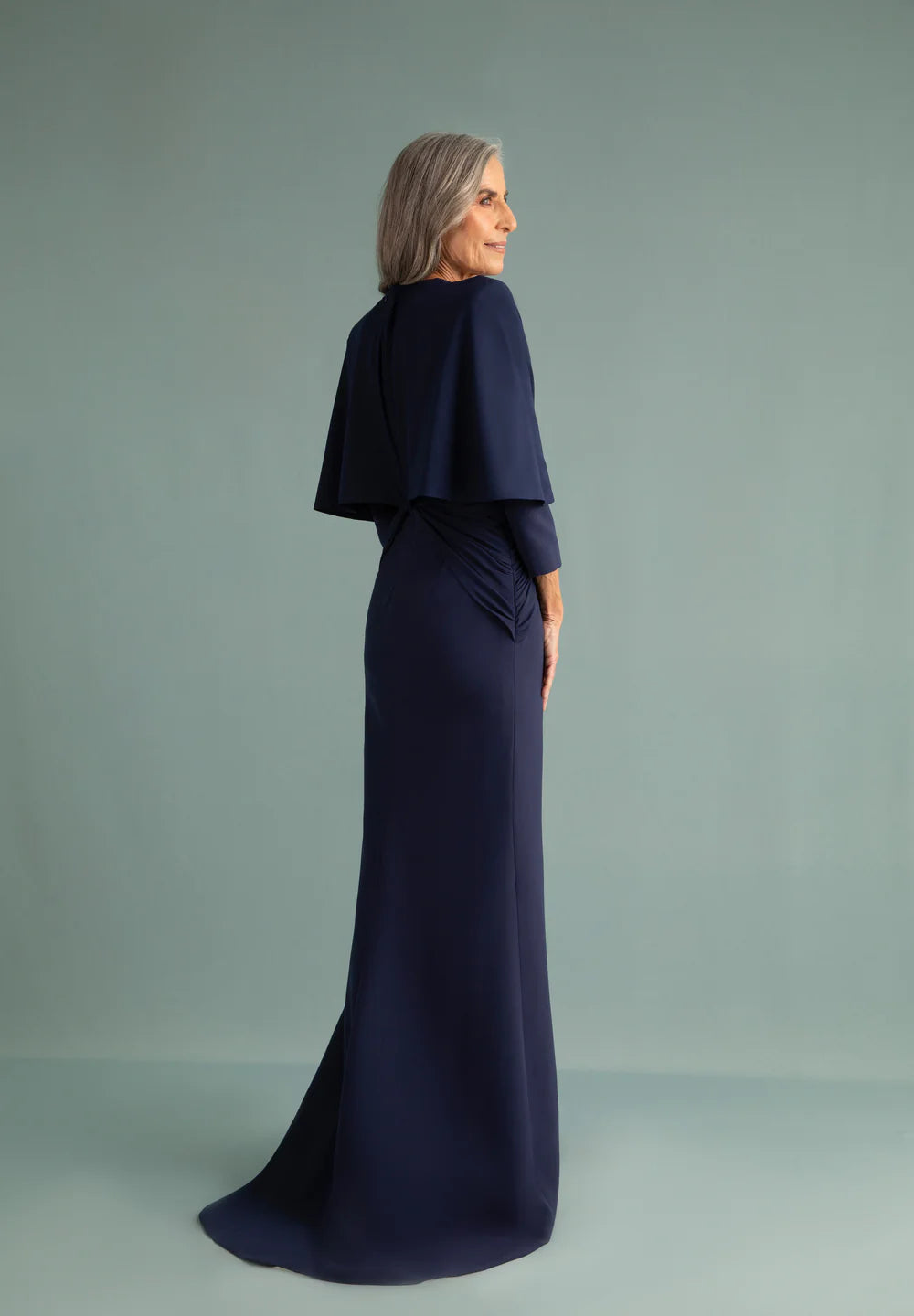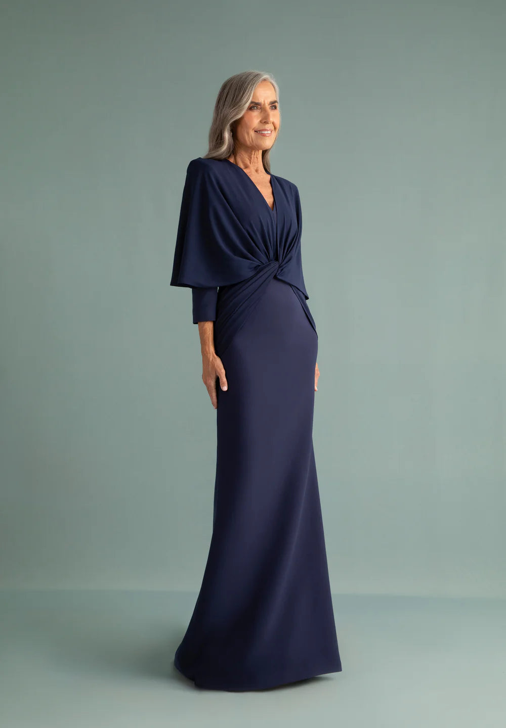 Crepe dress with fixed top in Georgette creating a layer effect It ties in the center with a drape towards the hip . Two color options: navy and raspberry.