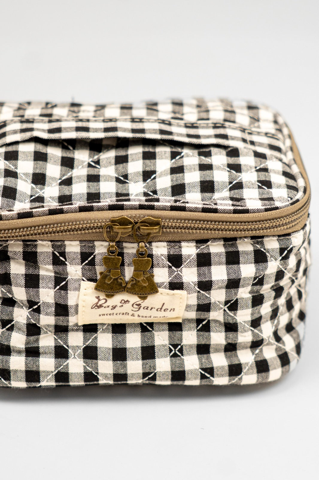 Toiletry bag with zip closure, top handle, interior pockets, in black and white gingham.