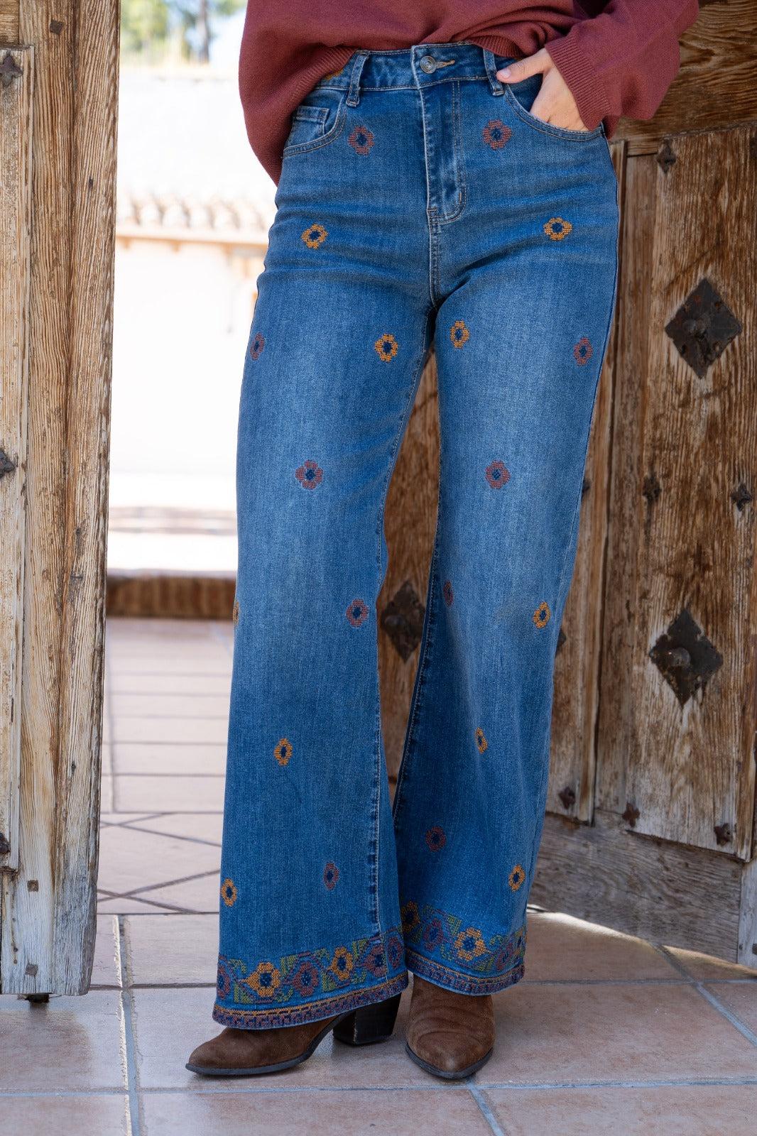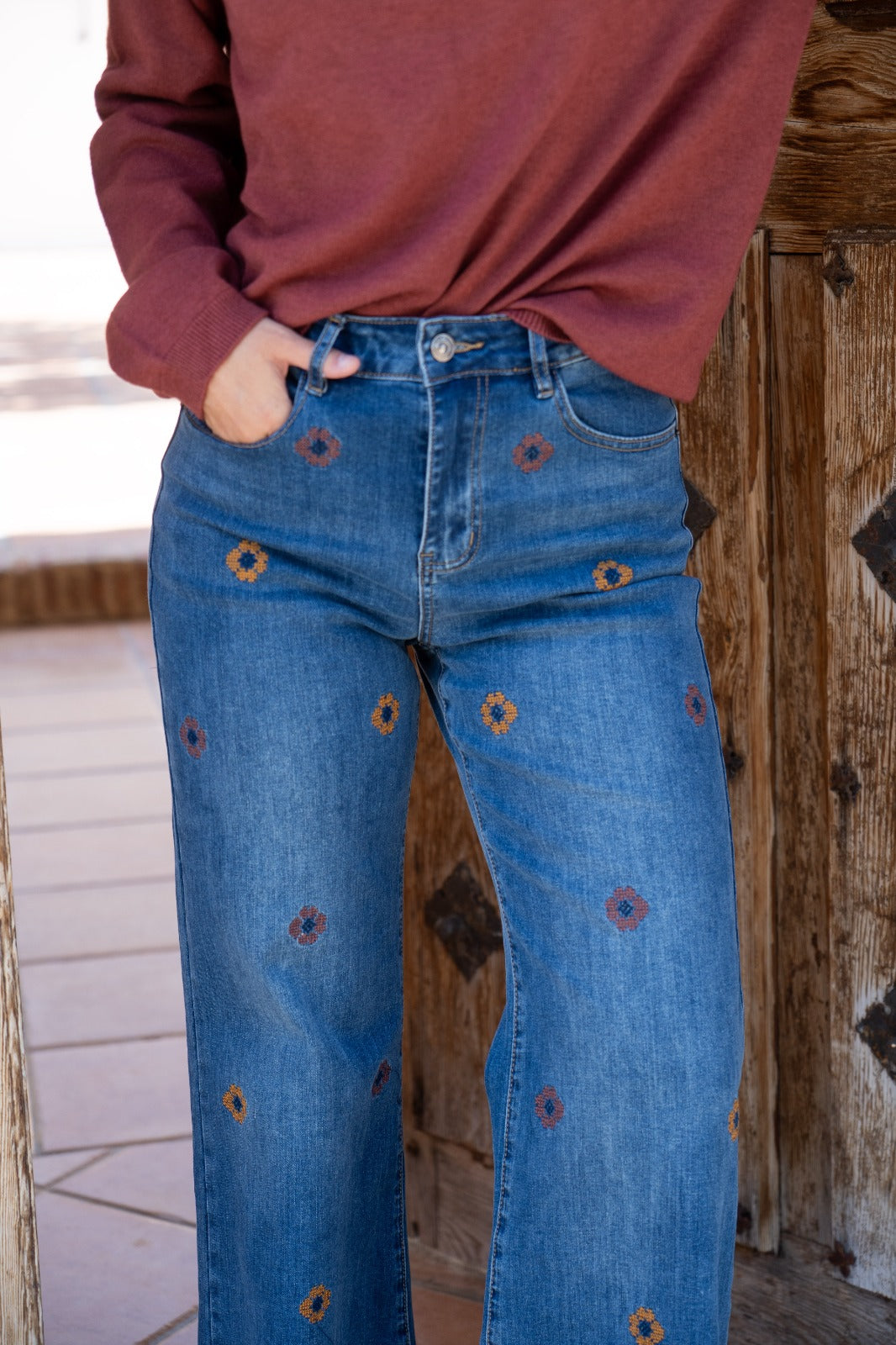 High-waisted jeans with back and front pockets, straight leg. Denim color with embroidered details.